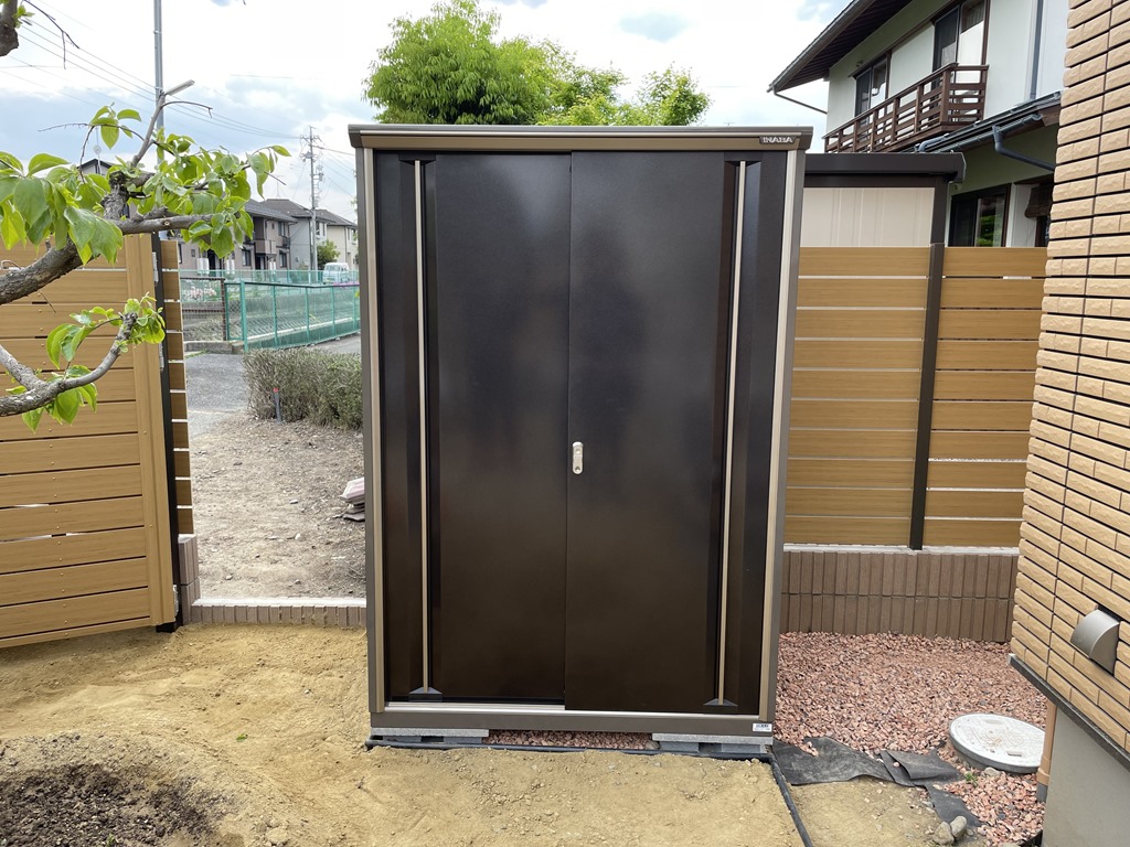 庭の片隅に、小型物置を組み立て設置。ちょっとしたものを入れるのにちょうどいいサイズ。カーポートやガレージ周辺の空間にもすっぽりと整理整頓ができそうですね!
