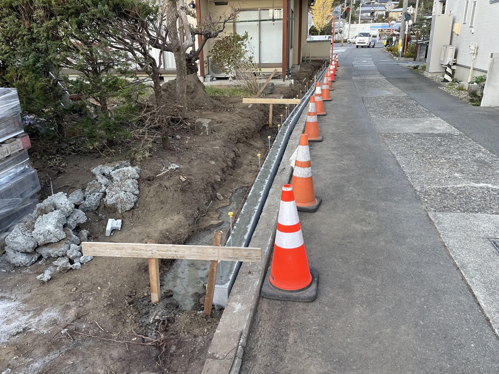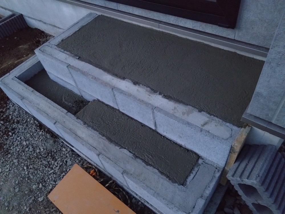 基礎ブロック、化粧ブロック積み 11月25日(月) この現場では、フェンス用の基礎ブロックを積みました。途中で折れているところがあるため、そこのブロックは加工してから積みました。スペースが狭く、目の前に道路もあるので、車や歩行者に気を付けながらブロックを運びました。 こちらの現場では、ベランダ部分の階段のコンクリート施工と、化粧ブロックの積みを行いました。階段の施工は、家が近いため、道具や汚れに気を付けながら作業しました。化粧ブロックは、フェンスの柱も立つため、寸法などしっかり確認しながらモルタルを詰めていきました。 長野市 塩尻市 松本市 外構 エクステリア