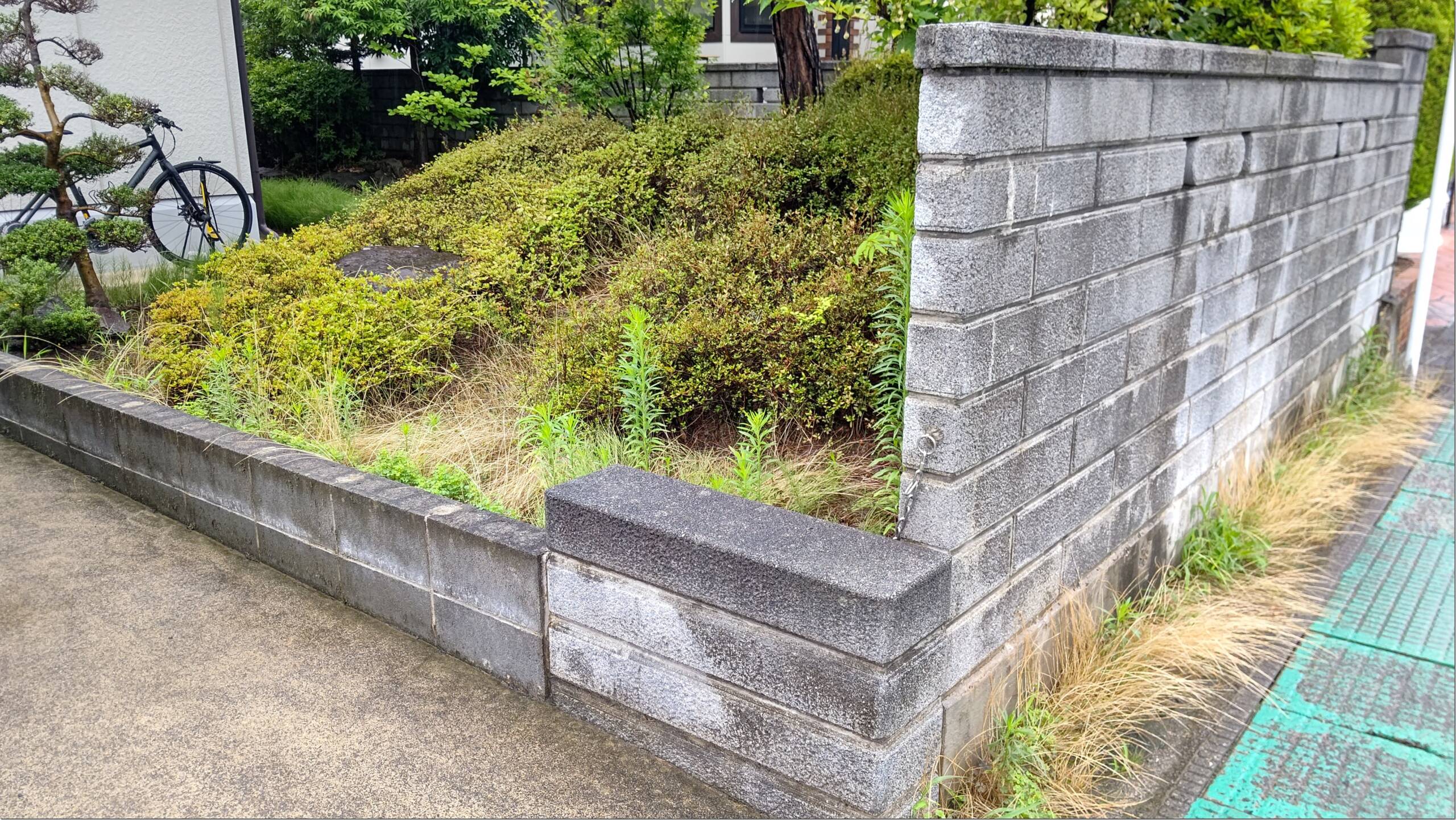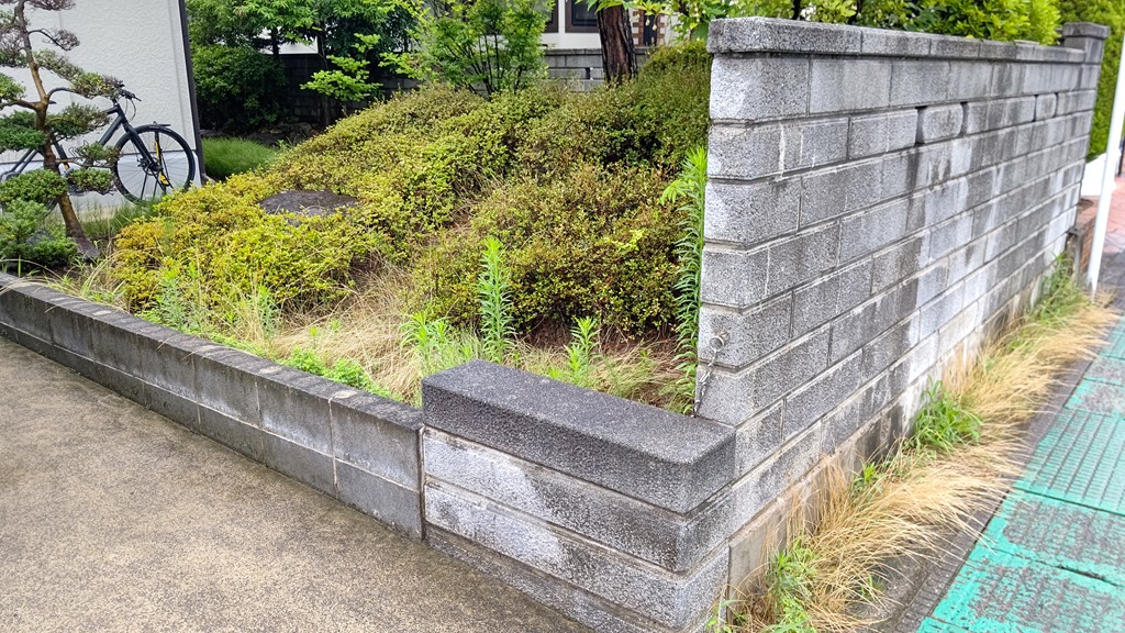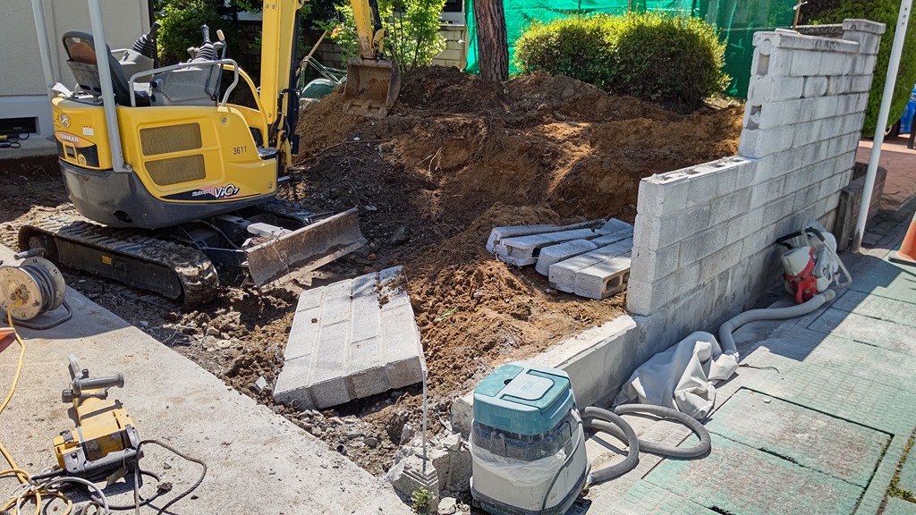 駐車場とカーポートと松根本の土留めを兼ねた浅間石積みのラインまでを、ブロック塀をカットと解体。