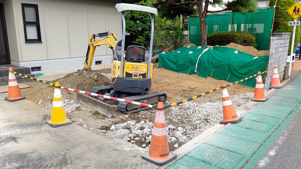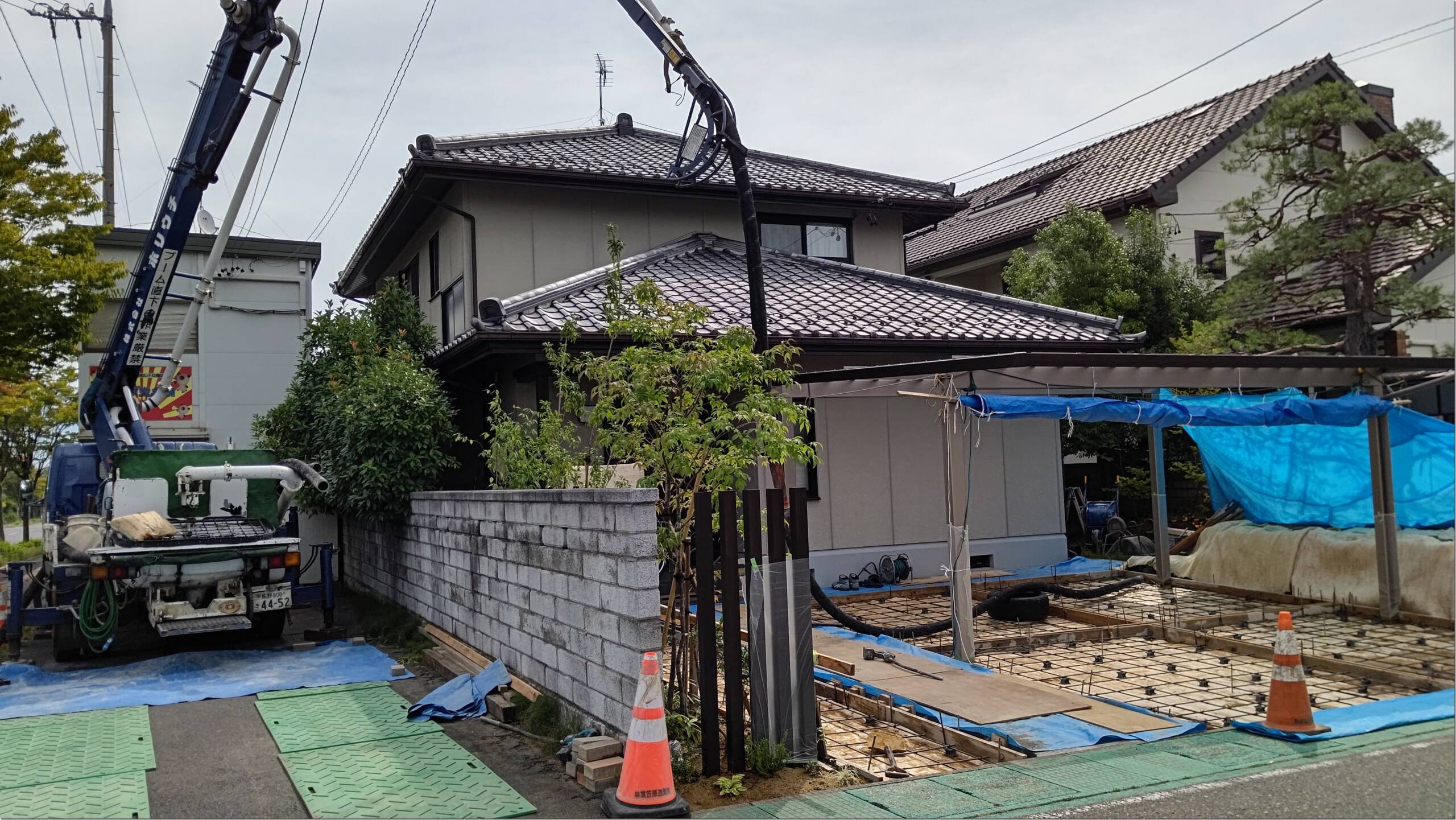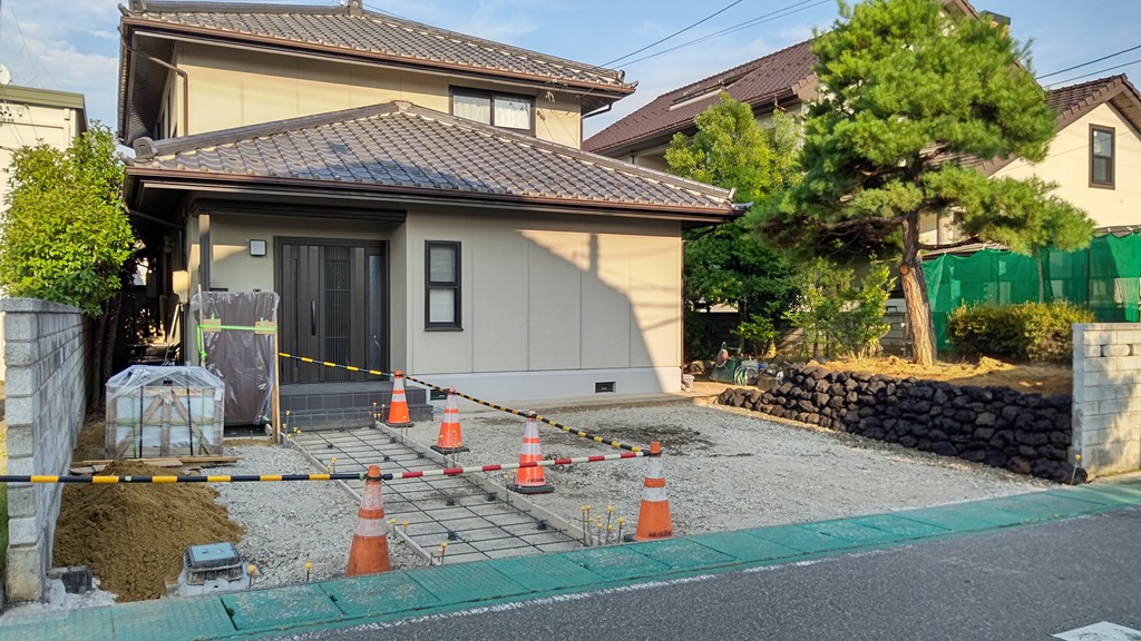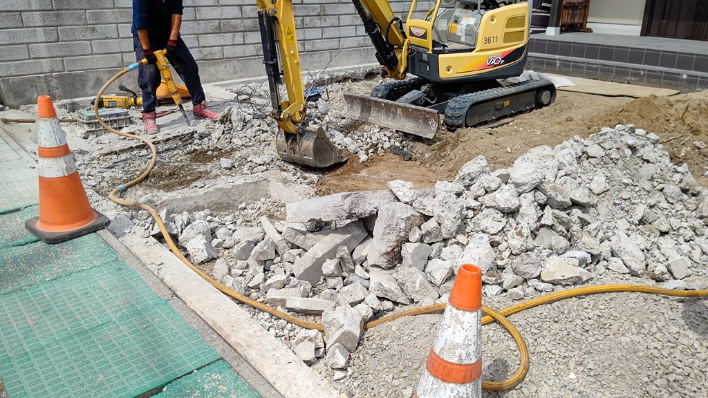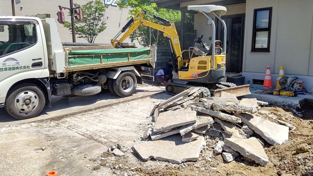 各工種の作業風景…カーポート、駐車場の間口を広げ、既存の古くなった土間の解体から工事は始まりました。