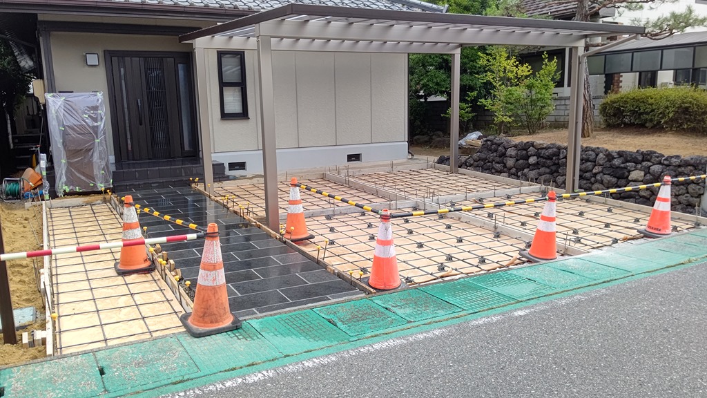 カーポートも寸法どうりにすっぽりと建て込み…土間の型枠…鉄筋配筋…路盤紙。