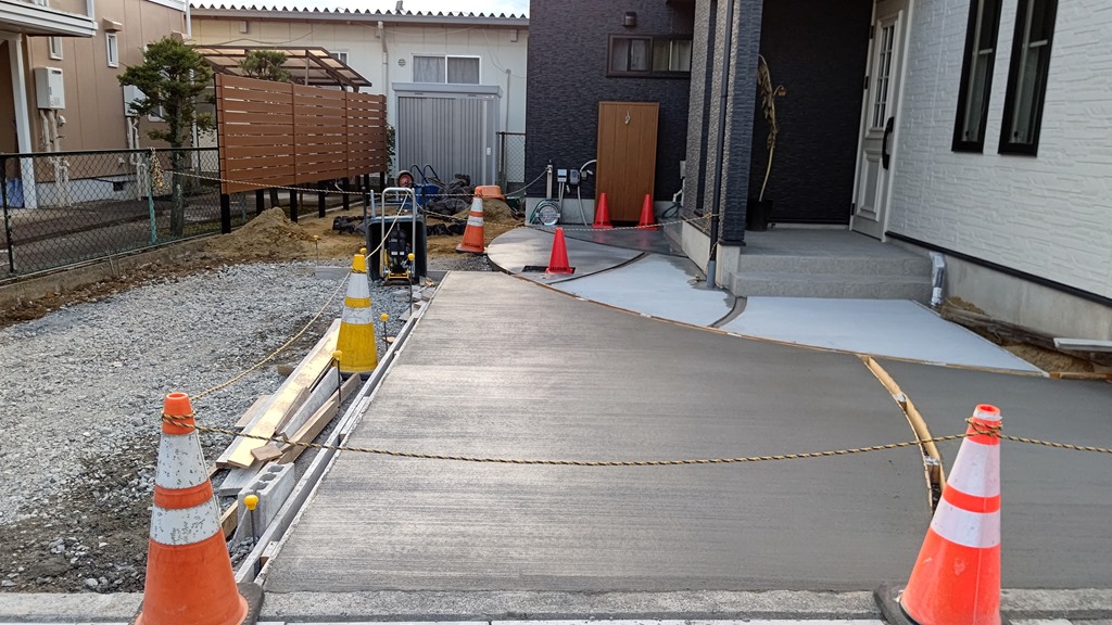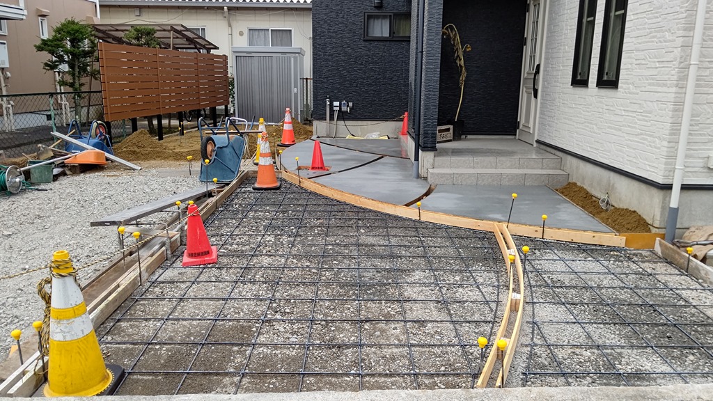 フェンスを張り、物置が出来上がり、玄関前アプローチの曲線的な土間目地、鉄筋もきれいに配筋されて…