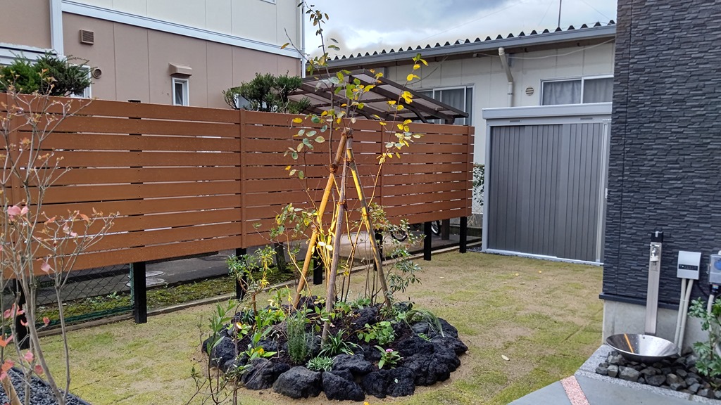 浅間石円形の中心に、ジューンベリーを植え付け、ライトアップをし、周辺にはミツバツツジやヤブランなどの低木、草花…高麗芝…