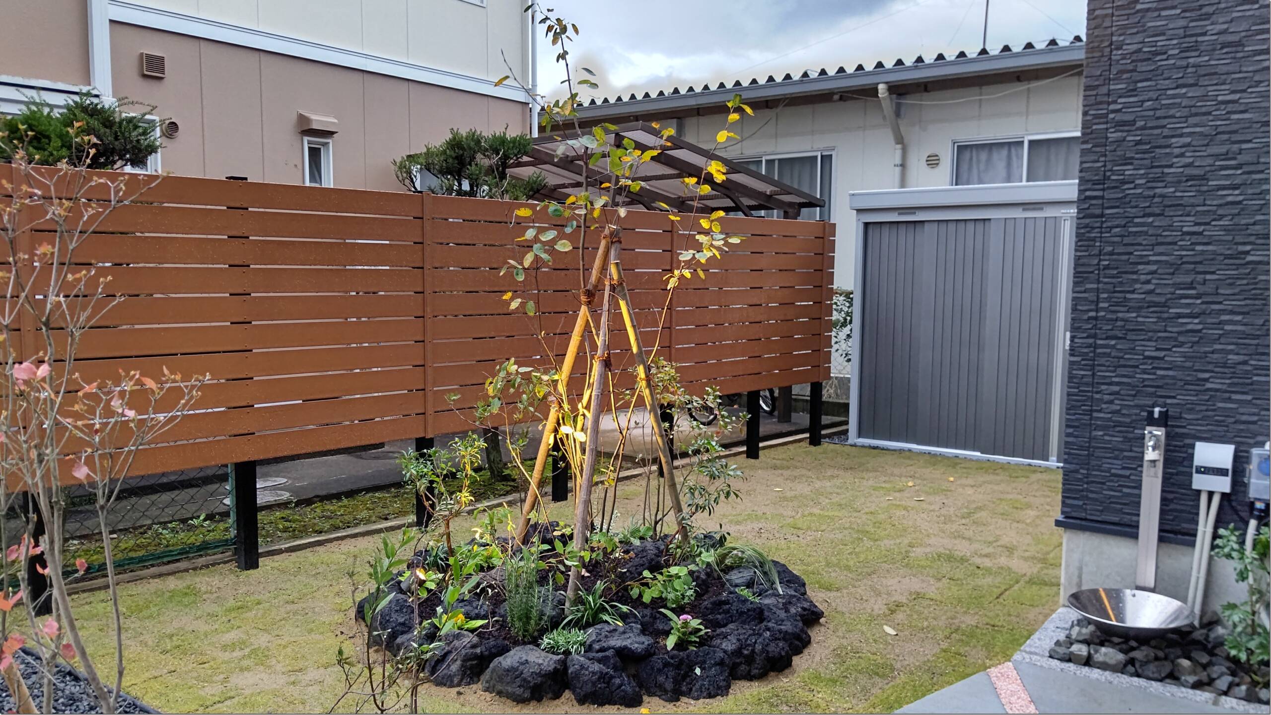 門柱にポスト、表札、ライトがつき、お庭に浅間石が据え付けられ…