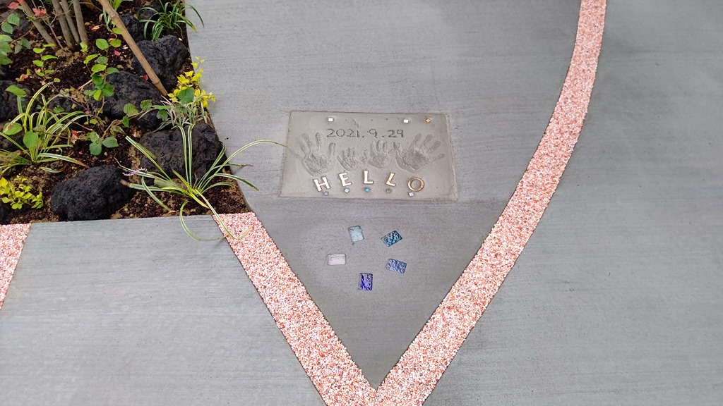 アプローチ横には、カットダル(カラーガラス)と、ご家族の手形と外構記念日!小さなお子様の手形も泣きながらも綺麗にスタンプされて安心しました。そして、完成となりました。