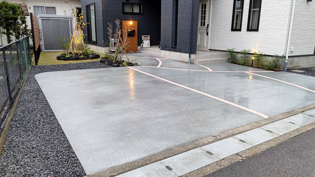 そして…完成となりました!駐車場とアプローチの目地には、ファイバーレジンで仕上げ、砂利色はローズピンクでおしゃれに…
