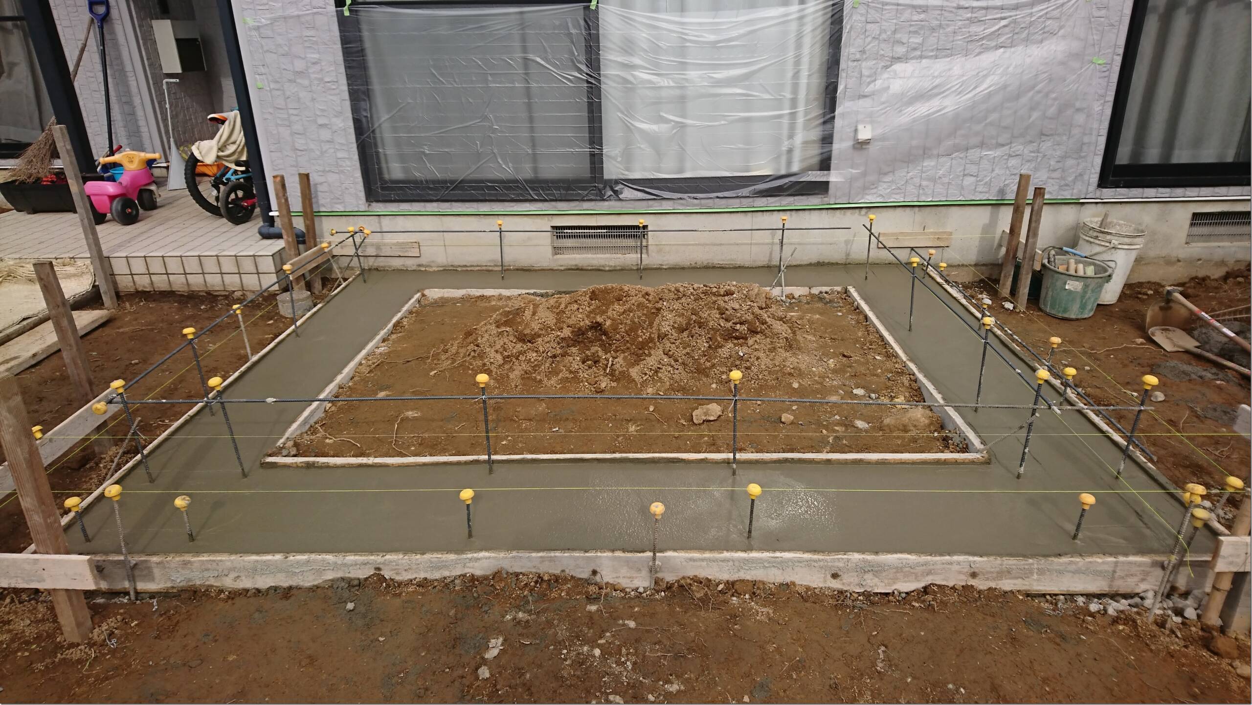 こちらのお宅はスキ土続きをして植栽スペースにエグミを入れ、土間コンクリートの型枠を組み始めました。