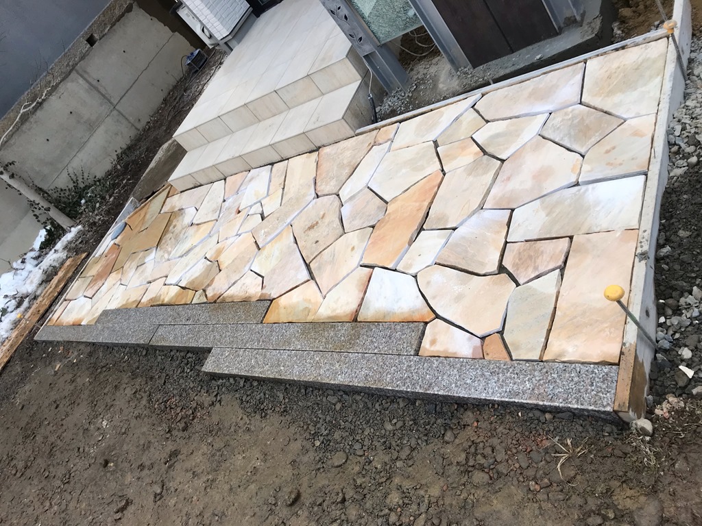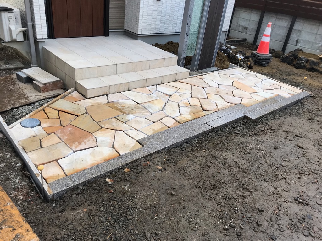 玄関まわりの石組み 1月28日(金) こちらのお宅では、玄関前の石組みをやりました。 この石組みの近くにはテコラがひかれる予定です。 石組みの色は、玄関の白系の色とテコラのオレンジや茶系の 中間系の色をしているので、綺麗な一体感ができそうで完成が楽しみですね! 長野市 外構 エクステリア