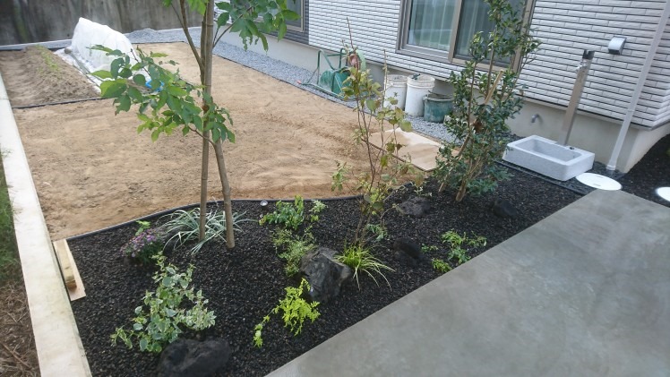 植栽の続きと浅間砂利 9月27日(金) 昨日に引き続き植栽です。アオダモ、ダンコウバイ、サザンカ、ミツバツツジを植え、周りに下草、浅間石を据えて浅間砂利を敷き詰めました。 今日も暑かったですが今年の30度越えもこれで最後になりそうですね。 一緒に蚊も落ち着いてくれると嬉しいんですけどね、、、(笑) 長野市 外構 エクステリア