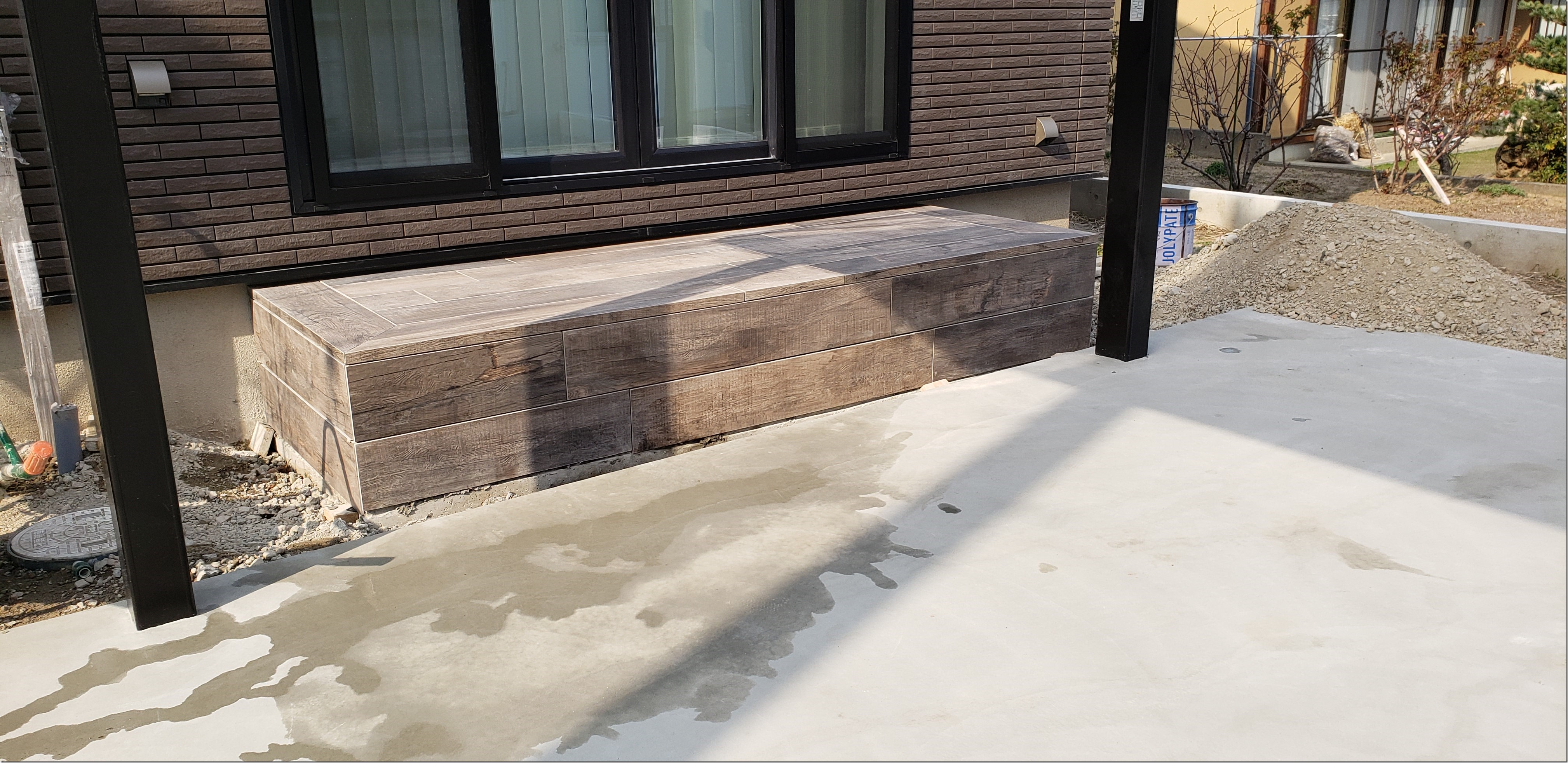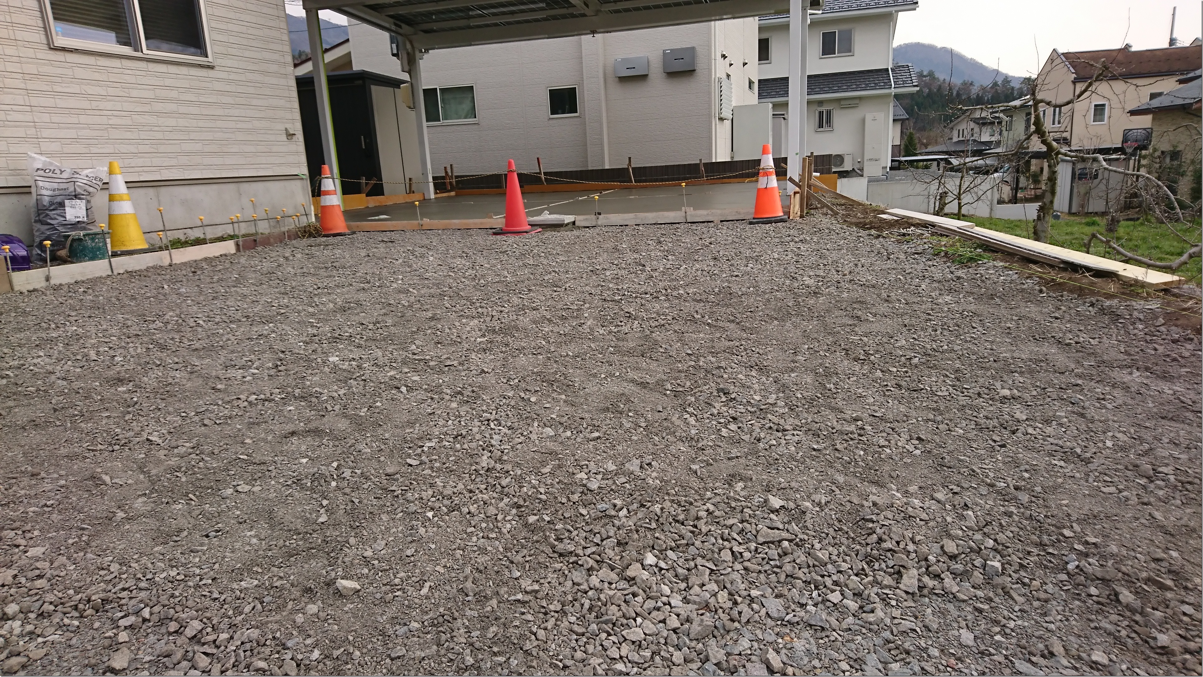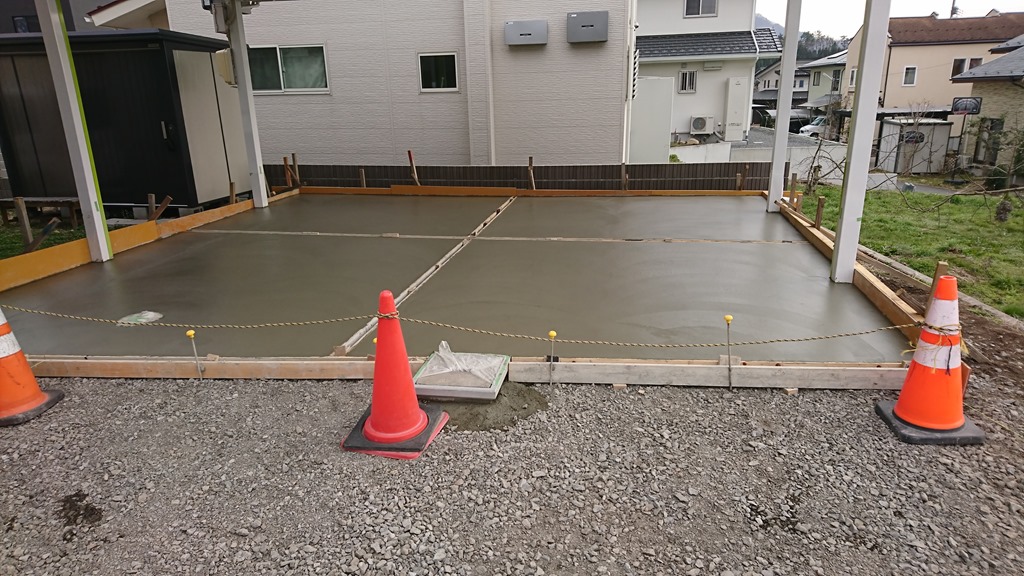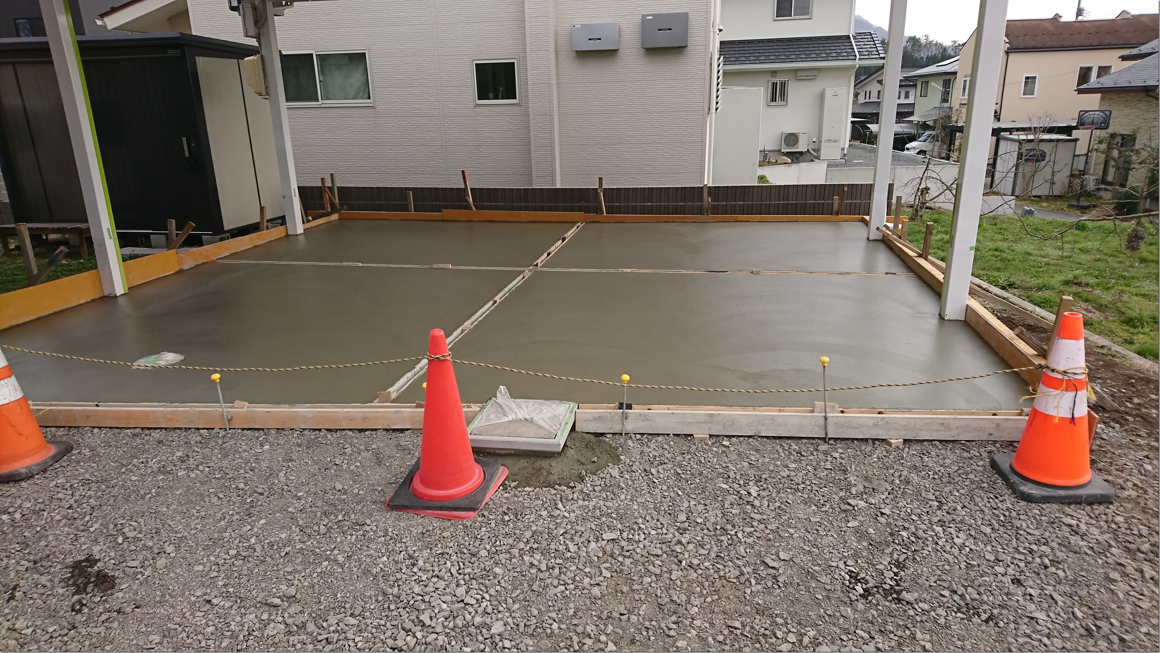 車庫入り口部分とカーポート下のコンクリートを打設しました。天気予報がころころ変わりなかなか読みづらいですが、無事に打設することができました。打設後は土間の周りに防草シートを敷き、テコラを入れて整地しました。