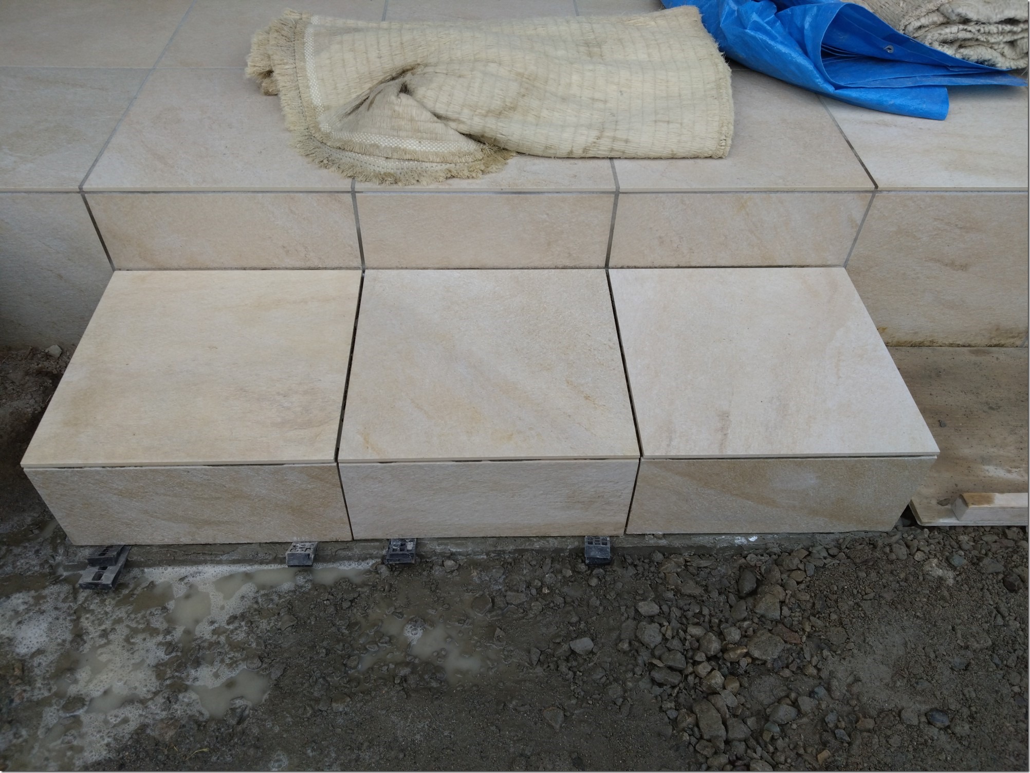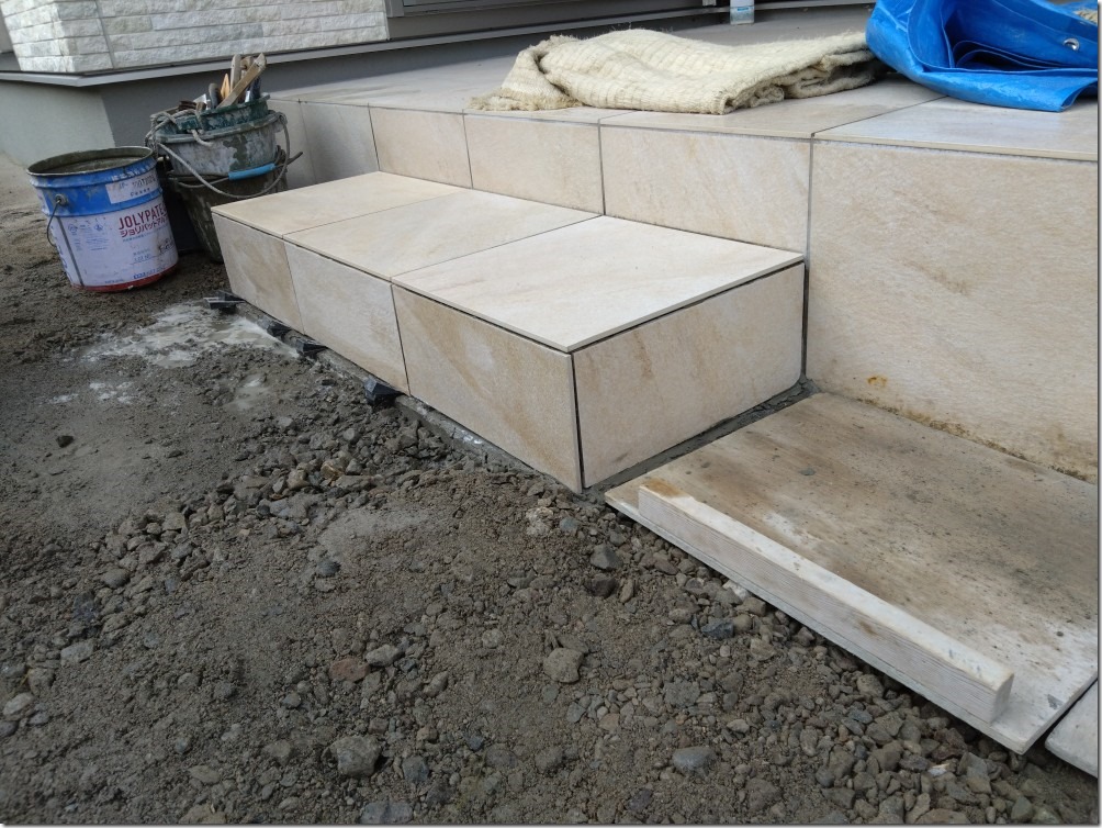 既存タイルテラスにステップを1段増設しました。天気が悪かったので目地入れは後日に。