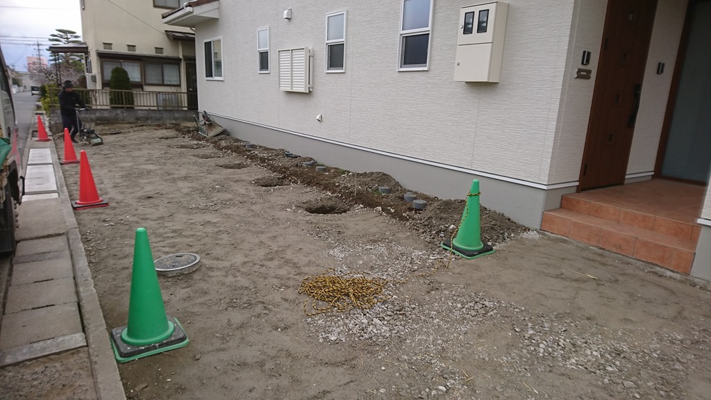 カーポートの穴掘りと下地、キュービックフォー 3月22日(金) ファインポートⅡZの二連棟の柱の穴を掘り、土間コンクリート部分の砕石を合わせて転圧をしました キュービックフォーの天端を仕上げ、目地を積めました 今日は風が強くて気温も低く、予報にない雨が降ったり、、、最近のぽかぽか陽気に慣れてきてしまっていたのでとても寒く感じましたね 長野市 外構 エクステリア
