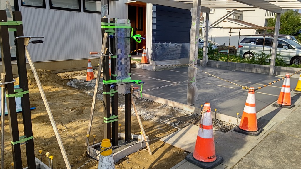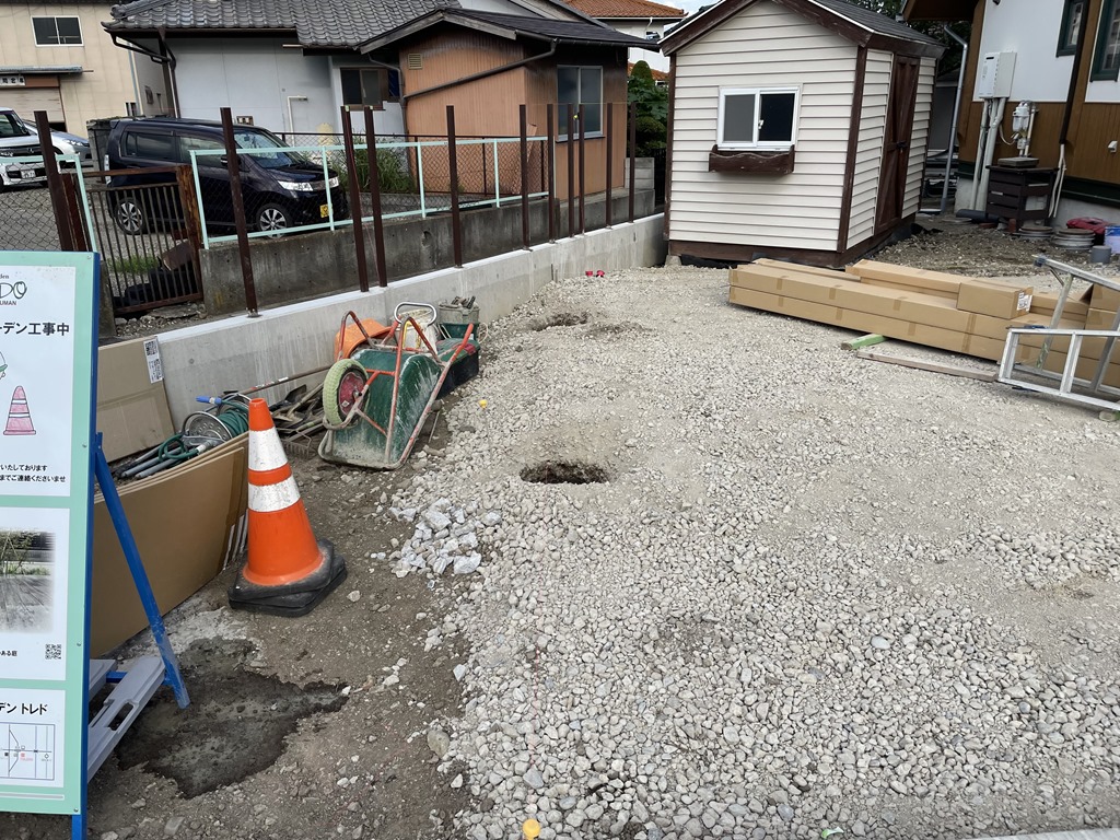 日頃の行い 8月23日(月) 先週天気の心配をしていましたが幸い晴れてくれましたね!・・・・・・日頃の行いですね! 晴れてくれたので土間コンクリート打設とポール建てとポールにジクウパネルをはめ込みました。写真だとぷちぷちにくるんである青っぽいのですね。梱包をはずしてからが楽しみですね。 こっちは前回に引き続きフェンスとウッドデッキを組みました。広々としたウッドデッキで色々出来そうですね。 こちらも引き続きフェンスの柱とカーポートの穴掘りをしました。明日建て込みなのでまた雰囲気が変わると思います。 長野市 外構 エクステリア