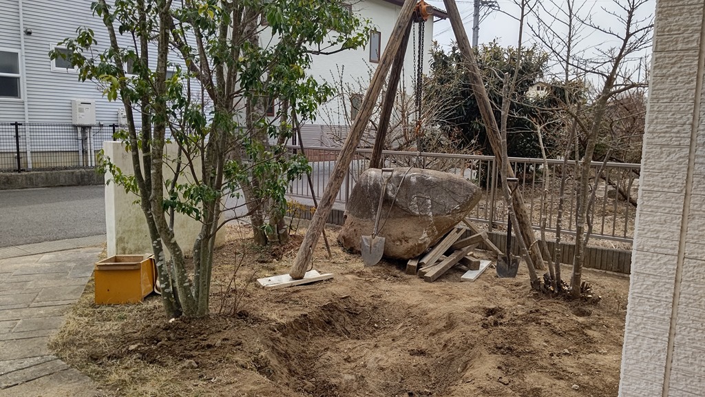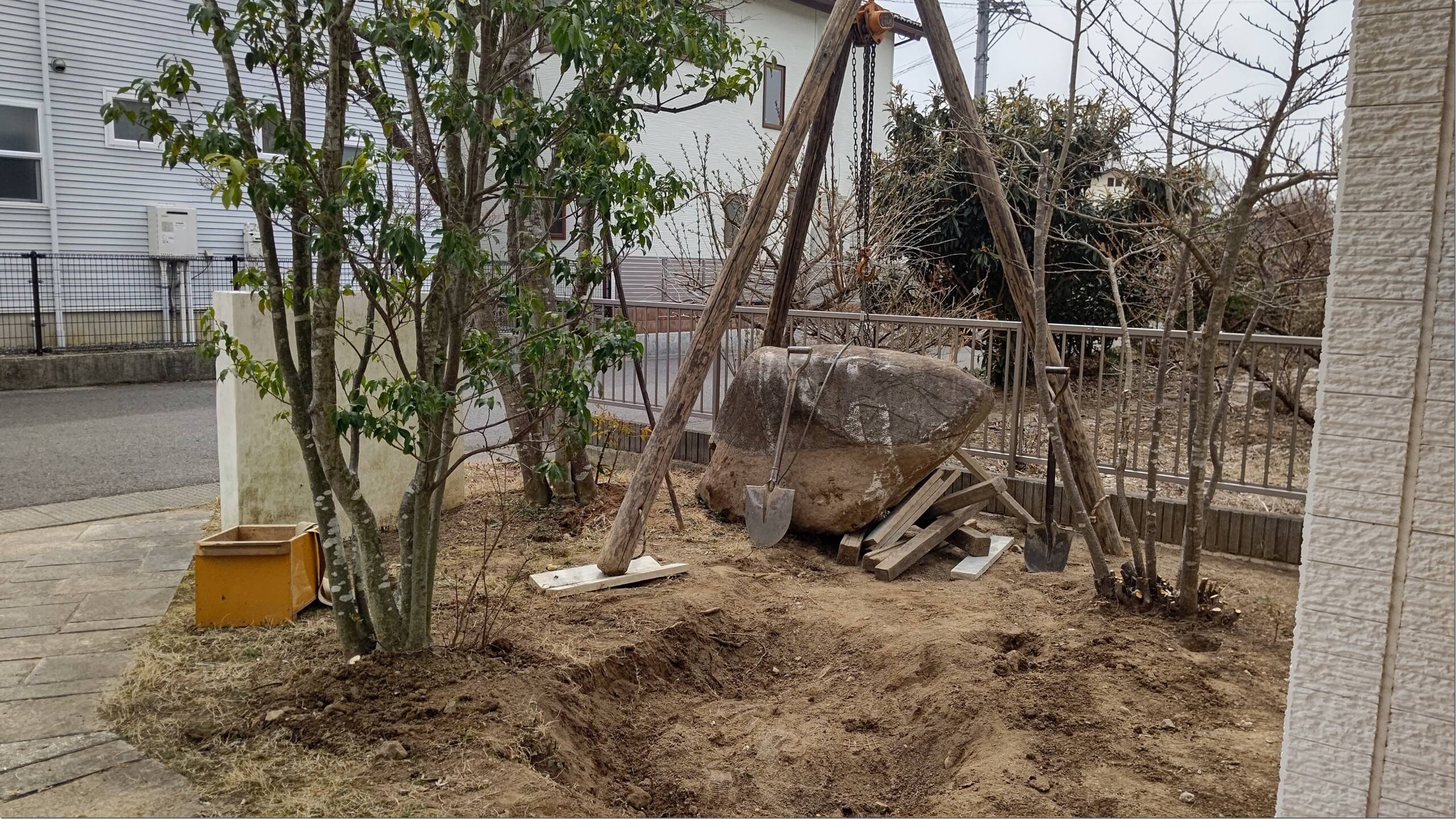 こちらのお宅では、景石の撤去作業を行いました。まだ途中ですが、最終的にはクレーンを使って吊り上げていきます。今日は道路と景石の距離が離れていたのでまだクレーンでは吊れないと判断して、三又を使い景石を道路側に近づける作業を行いました。