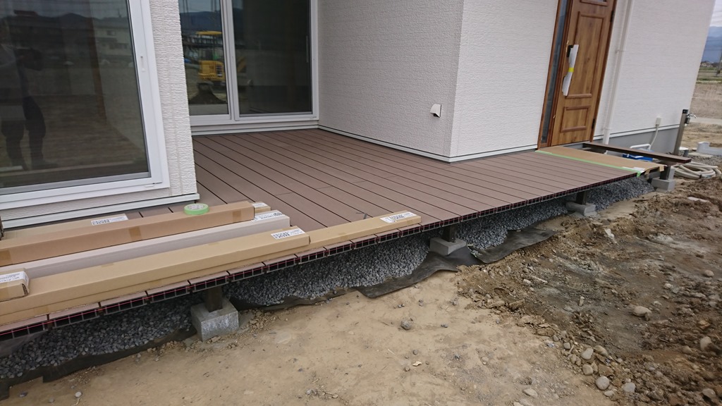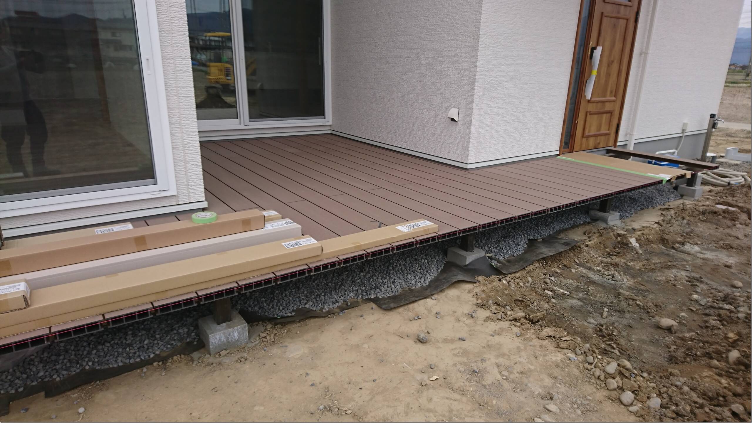 こちらのお宅では、ウッドデッキの取り付け作業を行いました。ウッドデッキの前にはステップが付きアプローチからスムーズに玄関まで行けるようになります。ウッドデッキの下には防草シートを敷き、五号砕石を敷き均してあるので防草対策もばっちりです。