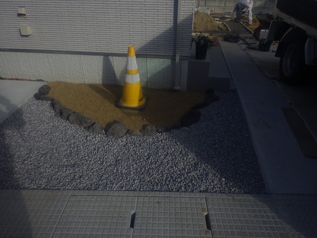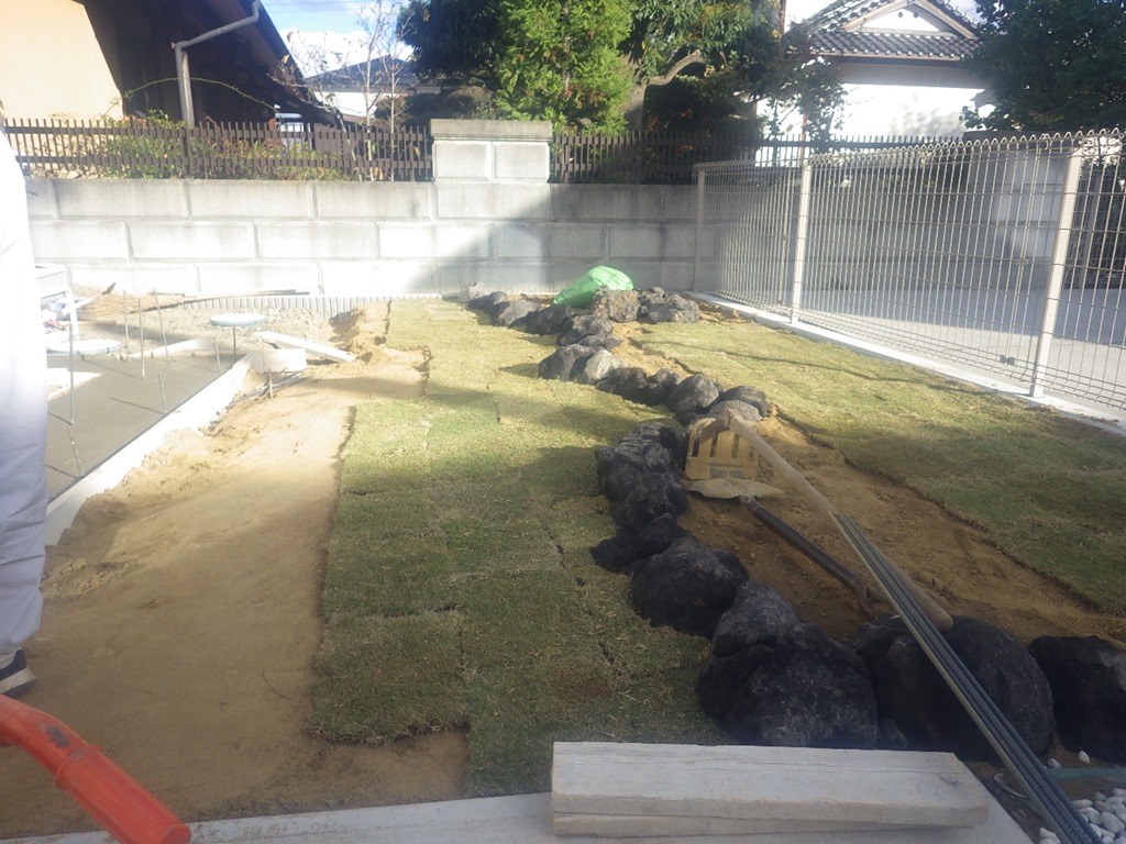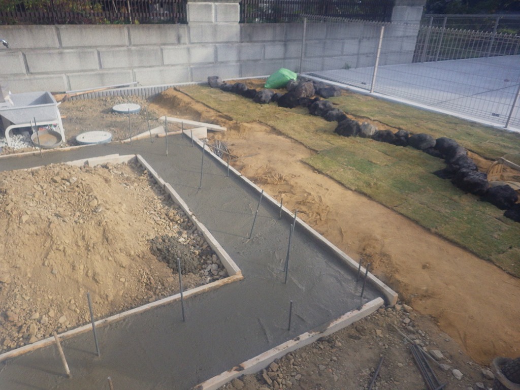 2018年10月31日2018年12月4日 テラス、ベースコンクリート打ち、外構工事、浅間石、高麗芝 toledo