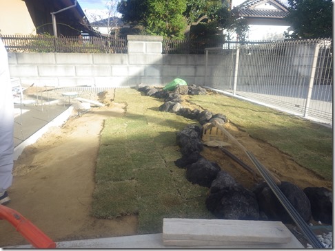 スタンドウォッシュリリーを据え、高麗芝を張り始めました。