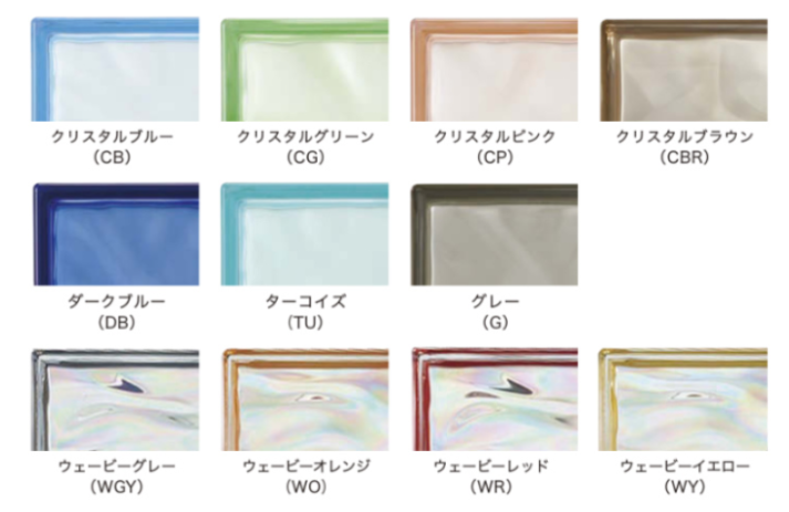 ガラスブロックは11色展開になっています。同じデザインでもガラスのカラーを変えれば、また違った雰囲気になります。