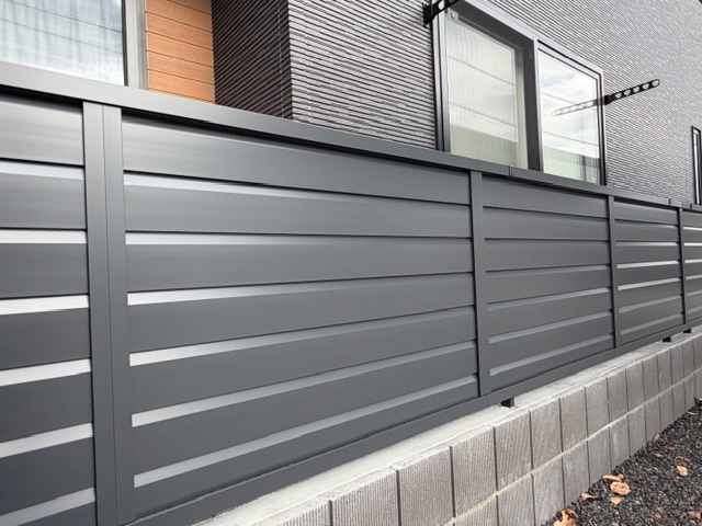 アルミ材フェンスは、リクシルのフェンスAB「ダスクグレー」色。