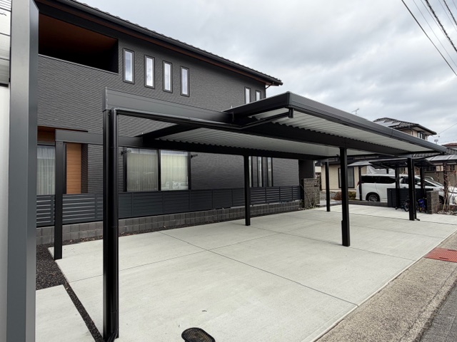 4台の車が停まる大きな折半カーポートはリクシルのカーポートSW。