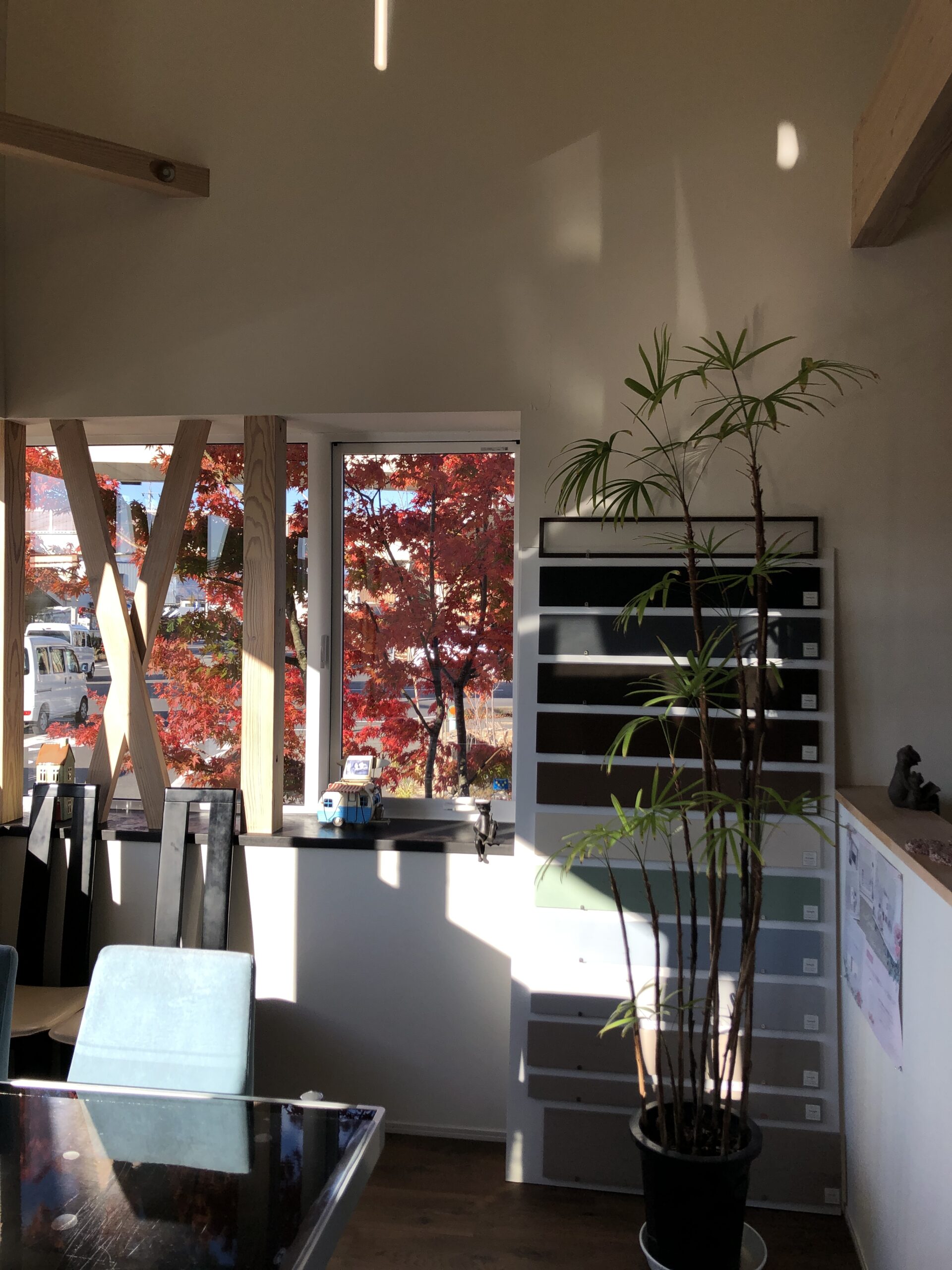 時間帯によっては西日がまぶしいくらいになる、西側の打ち合わせ席ですが、お昼過ぎの柔らかな日差しとモミジもとても綺麗でした。