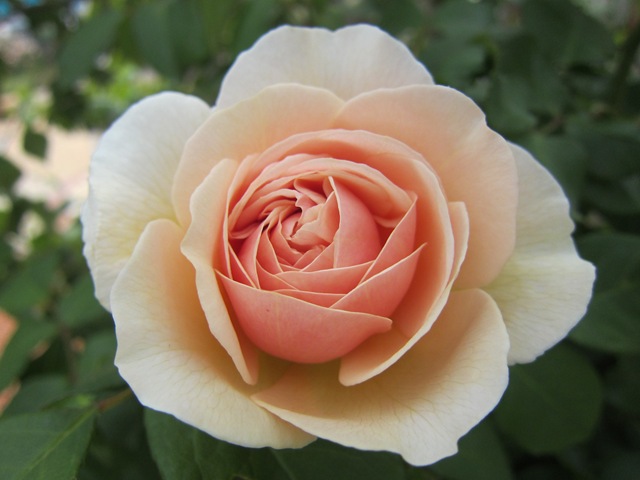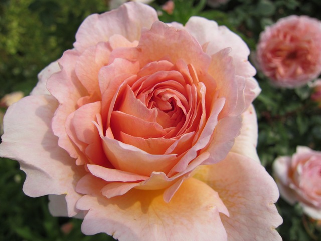 美しいアプリコットで薄いピンクが混じり外側にいくと白くなる花形は浅い皿状のロゼット咲きでピーチとアプリコットを思