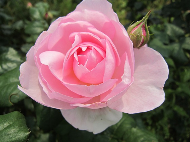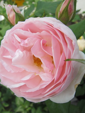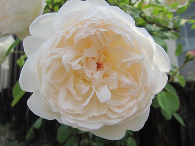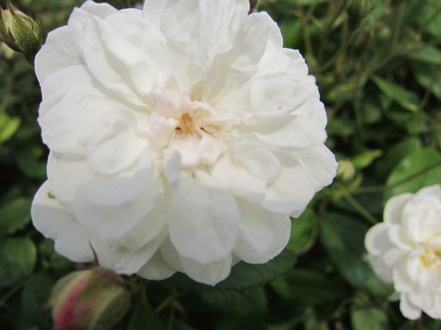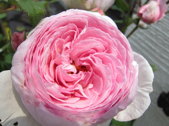 ジェフハミルトンで花の外側の花弁が白くなり魅力的で淡いリンゴの香りのする薔薇です、右側は中輪のロゼッタ