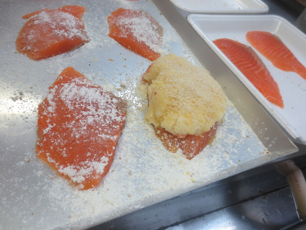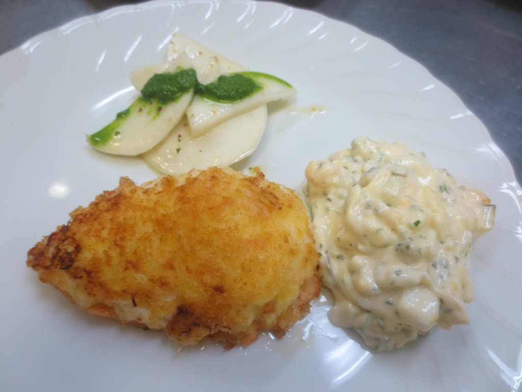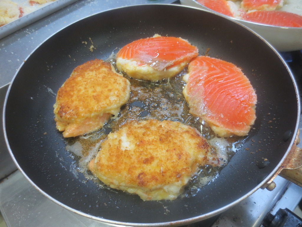 サーモンのカニコロッケ乗せタルタルソースです。 毎回、タッパに少し私の為に残してくれた料理を持ち帰ってくれるので、味見をしています。 どの料理も美味しいですが、できれば作りたてを食べ゜てみたいです。