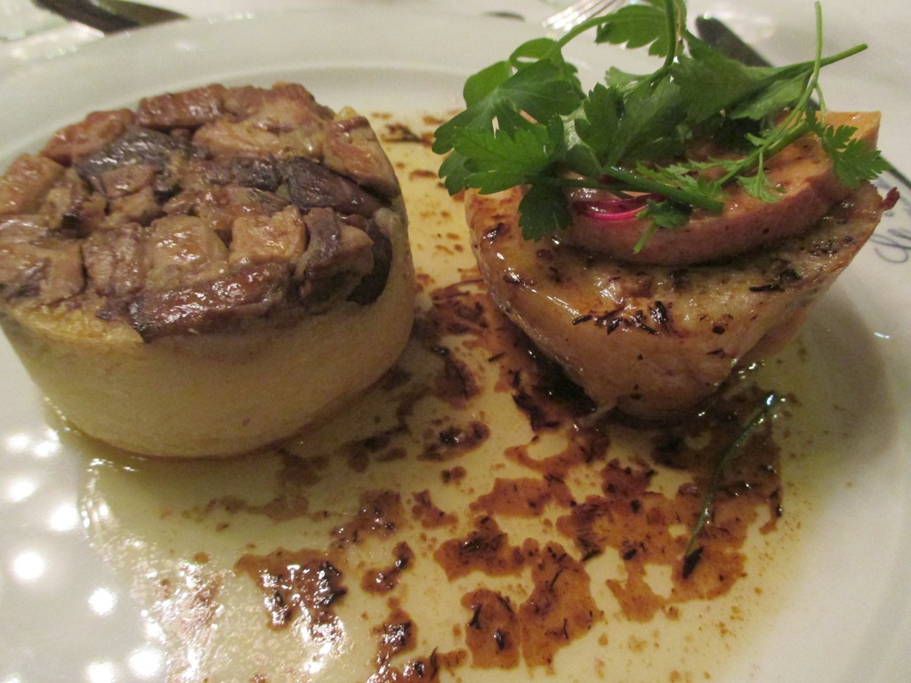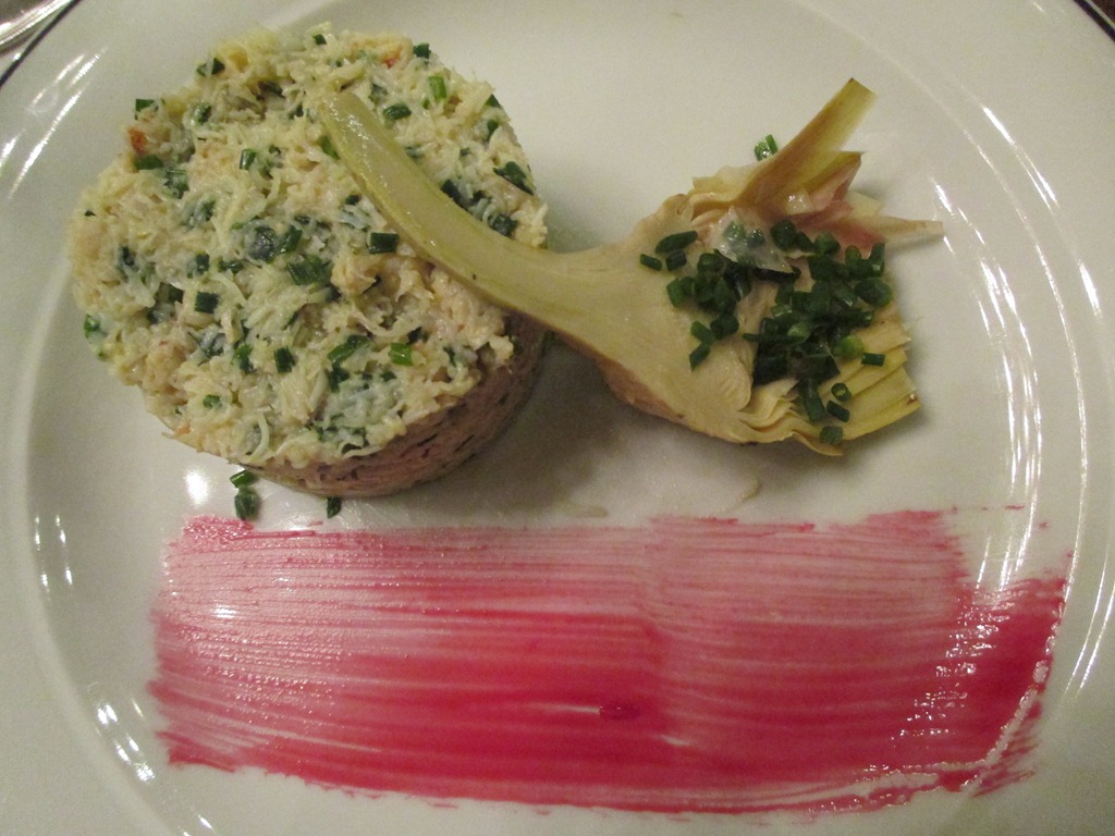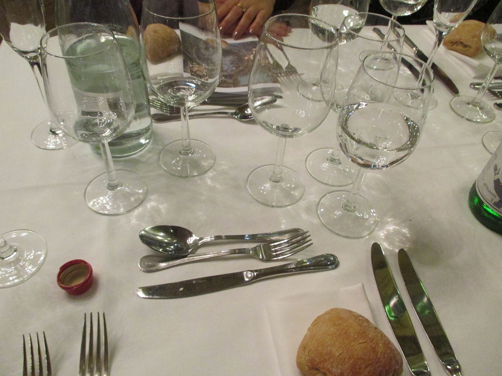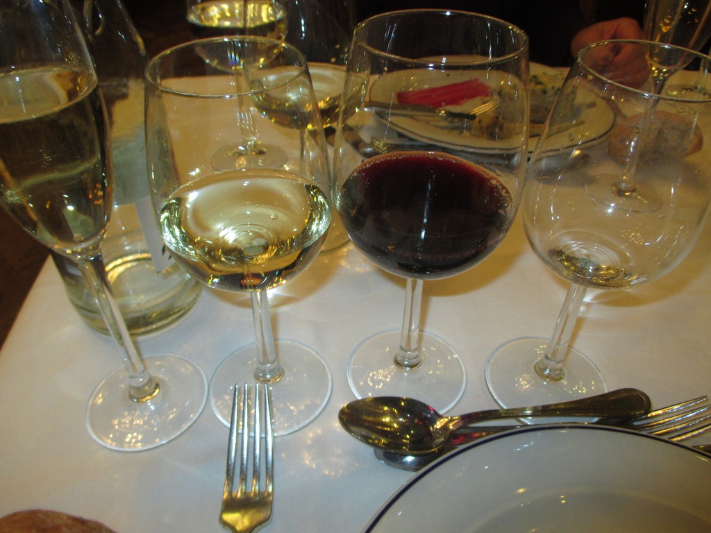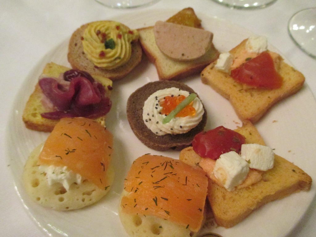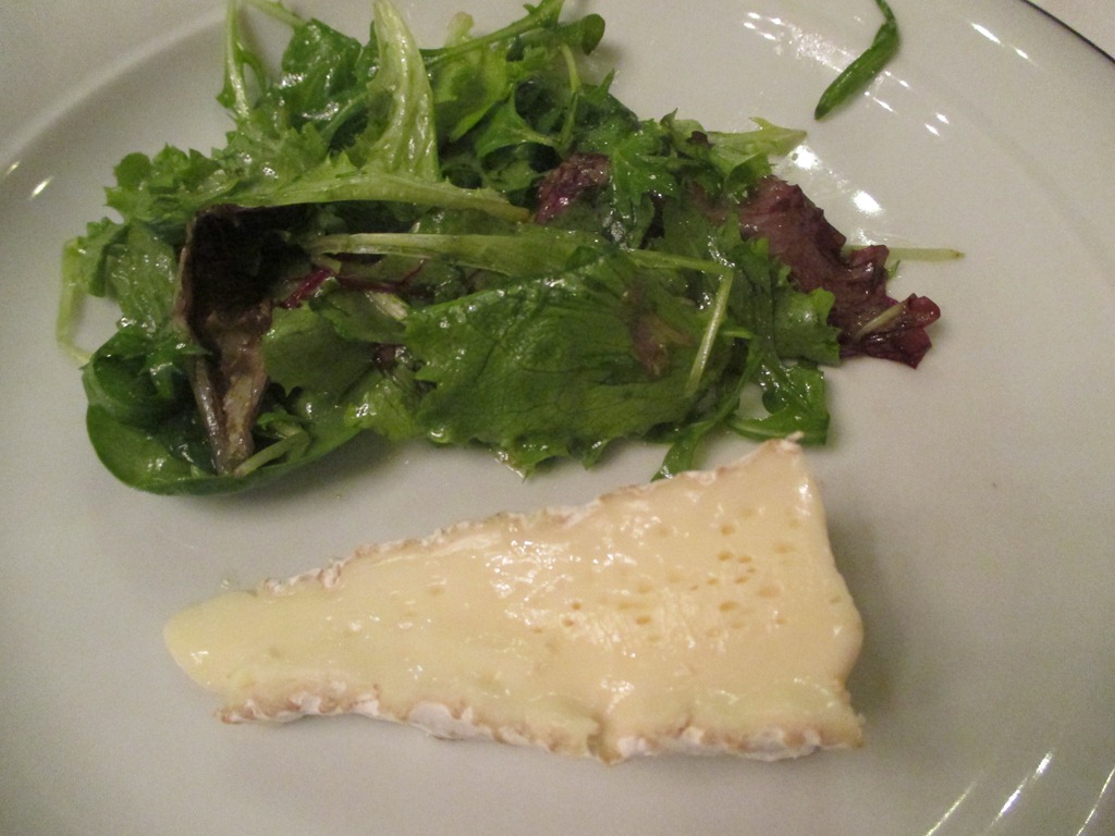 テーブルの上にはガラスコップが一人に4個置いてあり、どうなるのかと思っていたら、細めのコップにシャンパンが注がれました、飲めないけれど、せっかくのパなので一口飲んでみました、次に注がれたのが白ワインと同時に蟹肉料理です、次に注がれたのが赤ワインで料理が鶏肉の上にフォワグラが乗せられていてもうひとつはポテトの上にきのこが添えてある料理です、それでデザートはカマンベールチーズ。 フランス料理のコースは基本的には前菜の他に3品で魚・肉・デザートで食事が終わったのは日本時間で朝の5時過ぎでした。 歳のせいなのか時差が以前より大変に思えました。
