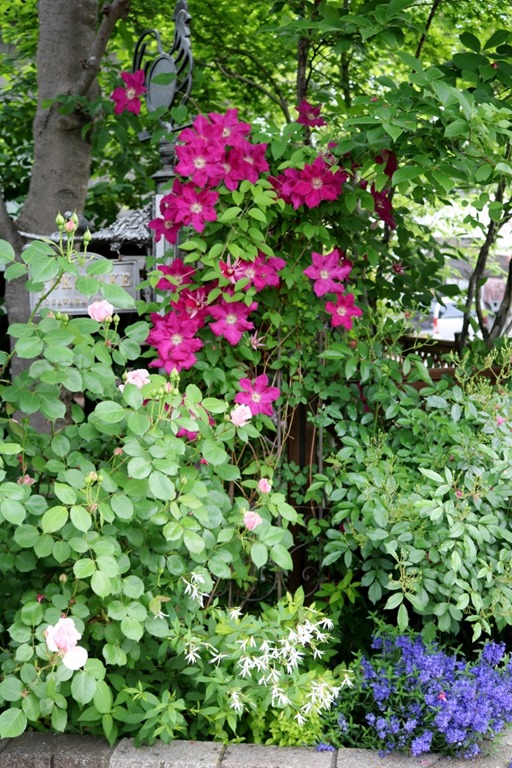 今年の春、5月中旬の様子で、風見鶏のポールにも絡むようにクレマチスのアーネストマークハムが花を咲かせていて、同じ場所にクレマチスの踊り場モ咲きます。