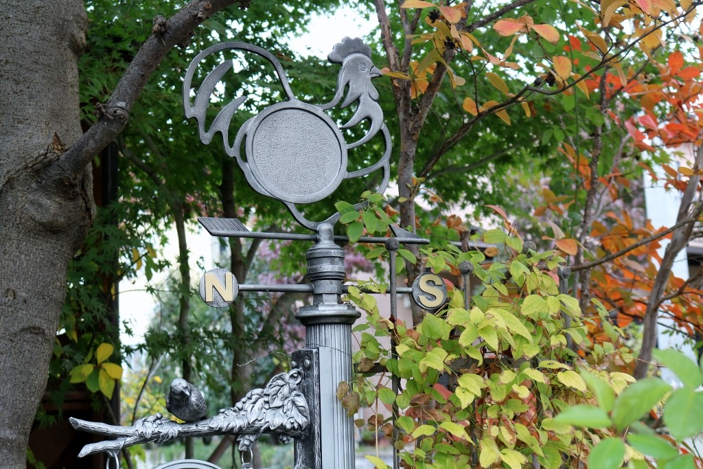 マロニエの木の前に造られた花壇スペースに立てられた風見鶏の昨日の様子です。アルミ制のシルバーカラー、ポールの上に鶏が乗り風が吹けば回るのですが、風が当たりづらい場所であまり回りません、サインはポール横の小鳥が居る枝にぶら下がるように付けられています。