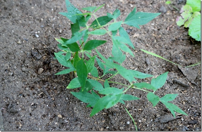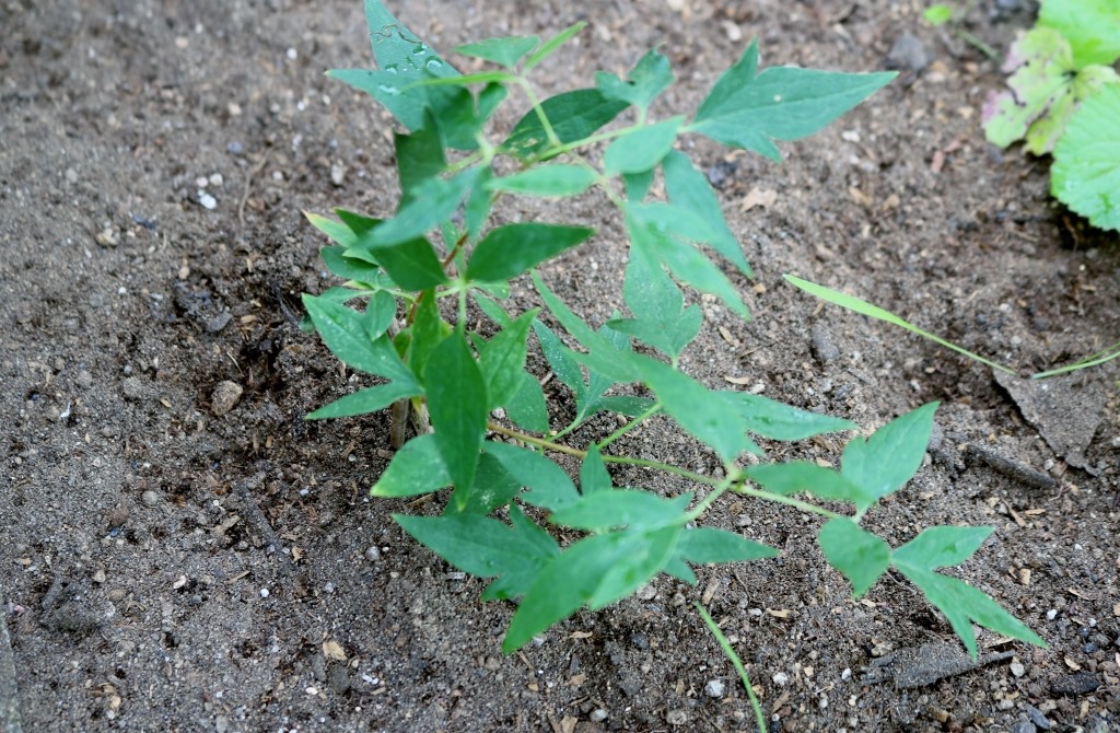 風見鶏のポールの根元に、クレマチスのエレガフミナを植えました。紫色の綺麗な花を咲かせて楽しませてくれるので、現在でも庭の4ヵ所に植えています。この株は、庭友に譲ったエレガフミナを友人が挿し木をして幾つも増やして一株で里帰りです。