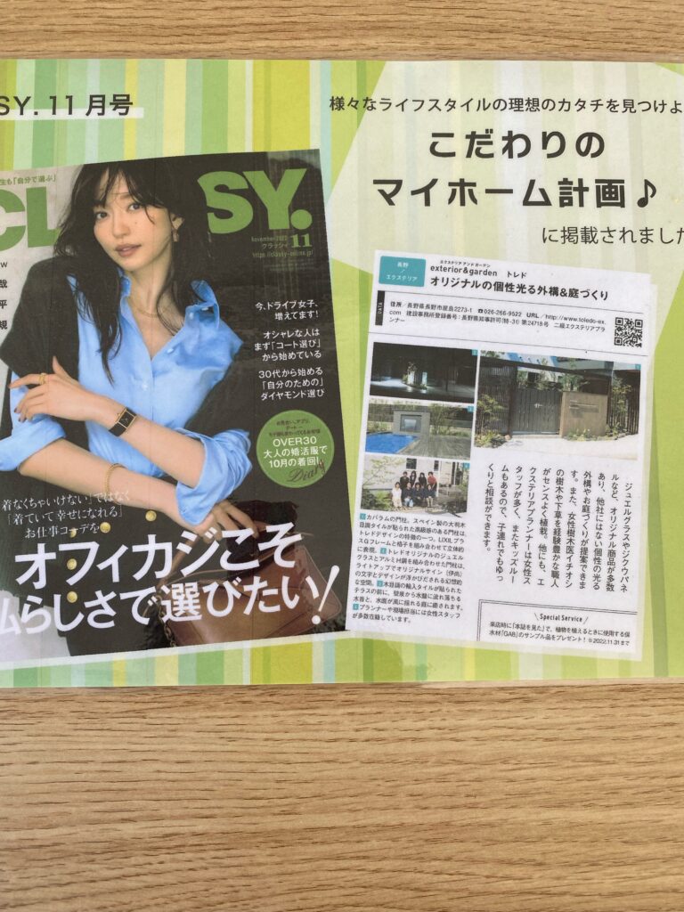 CLASSYに掲載されました トレドショップがファッション誌「CLASSY」に掲載されました!エクステリア専門誌ではなくファッション誌というところが新鮮です!全国の色々な地域の住宅会社さんや外構業者さんが掲載されています。 来店時に「CLASSY]を見たで、トレドの植栽の時必ず使用している植物用保水ポリマー「GA8]のサンプル品(30g)をプレゼントしています(2022/11/31まで)
