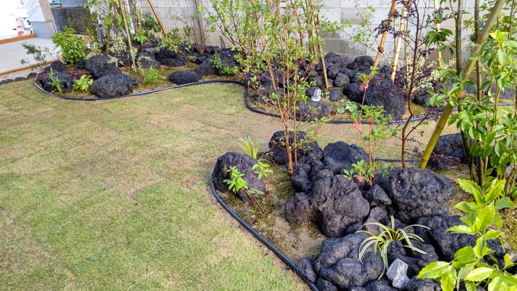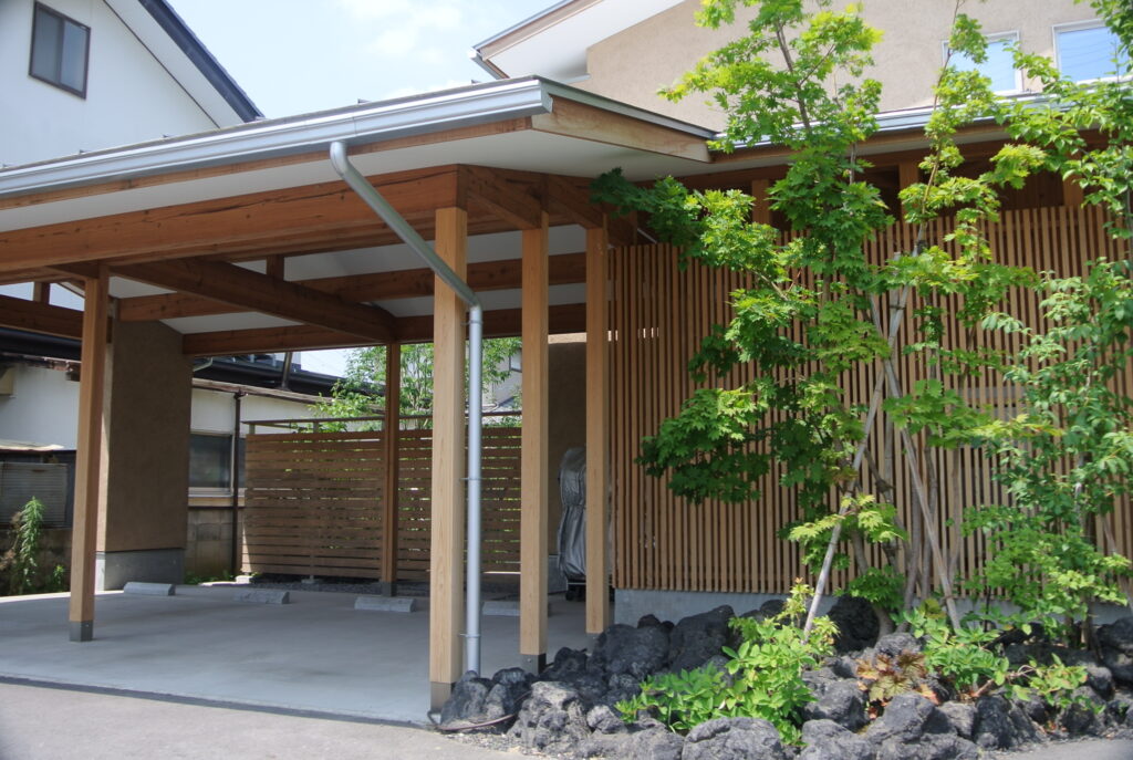 天然木の温かみをいかしたとても素敵な住宅の設計に、力強い浅間石と樹形の美しい植栽を施工し、