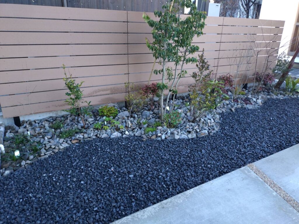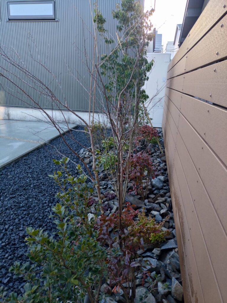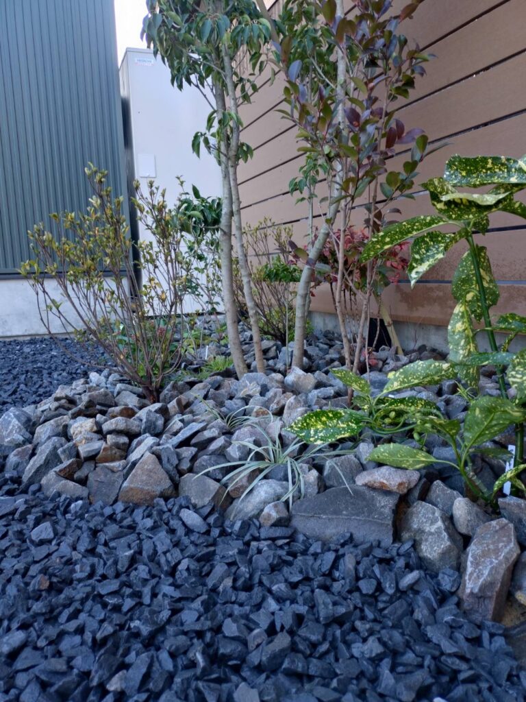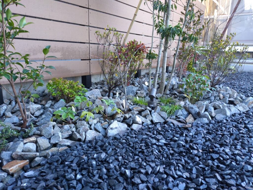 12月に完成した植栽現場の紹介です。冬場でも緑を楽しめるように常緑樹を中心的に植栽し、天然石のゴロタを敷き詰め仕上げました。