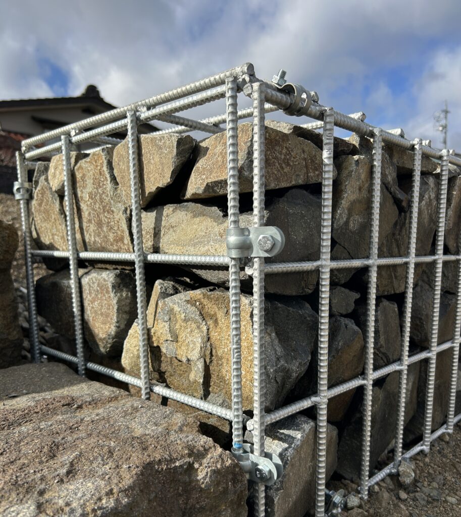ガビオンは亜鉛メッキ鉄筋で組んだカゴの中に石をつめて作っていきます。綺麗に見えるように石の向きを考えながら中に石をつめていきます。