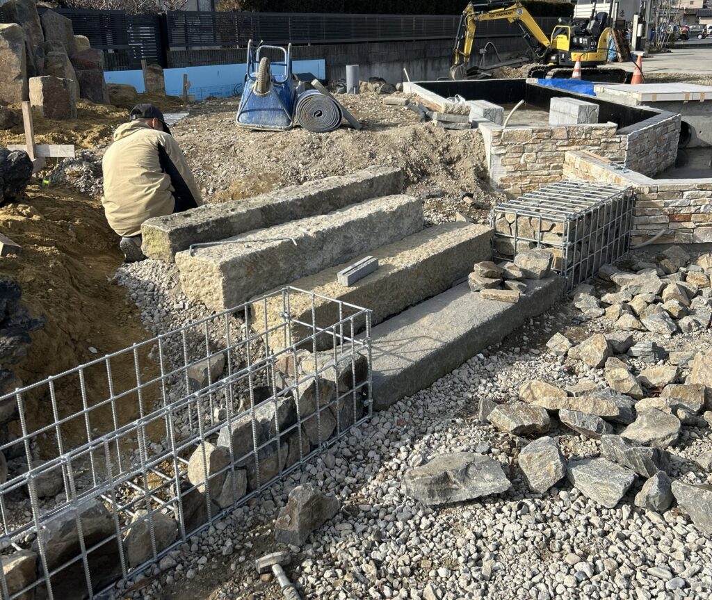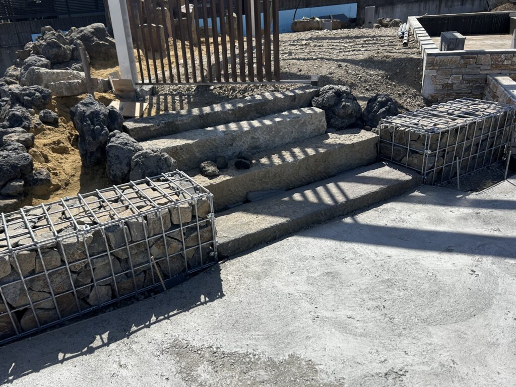 階段の両脇にとてもきれいなガビオンが出来ました。存在感があり良い雰囲気が出ています。