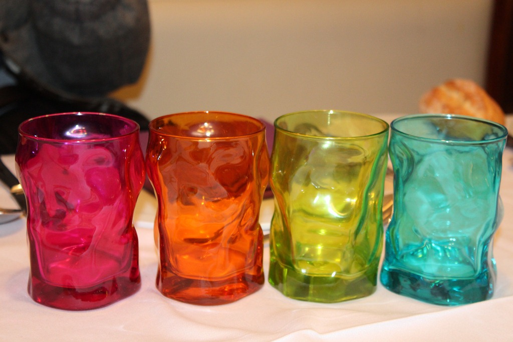 テーブルの上に置かれたガラスのコップ、みんな色が違って綺麗です、スペインの街は古いものと新しいものが共存する街でお洒落な感じもいっぱいでした。