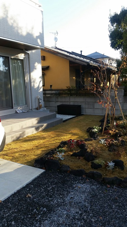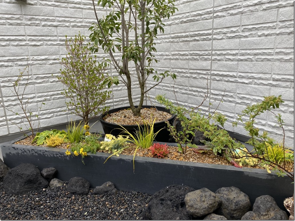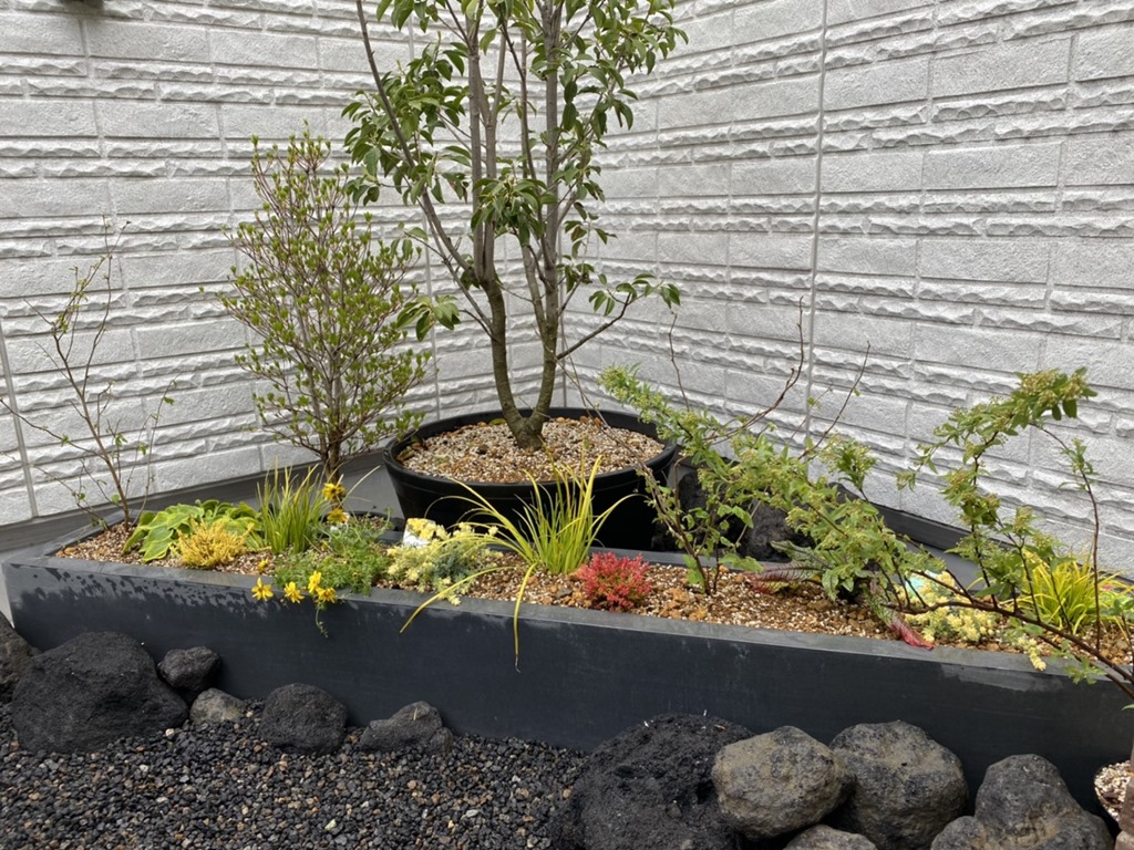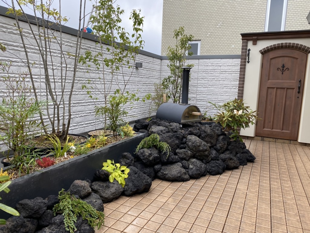 こちらのお宅では2Fのテラスを庭にリフォームしたいというご相談でした。住宅メーカーでは2Fのテラスにかかる重量を110キロまでと想定しているということで、その重量を計算していくと土をいれるとなかなか難しかったりで植栽ができるところと鉢植えにするところと色々と試行錯誤でした。冬場にできる仕事をさせてもらい、先日最後の仕上げで植栽を終わらせて完成しました。ピザ窯を置いたりしているので、これからいい季節になったらテラスにでて過ごす時間が増えるとうれしいです。