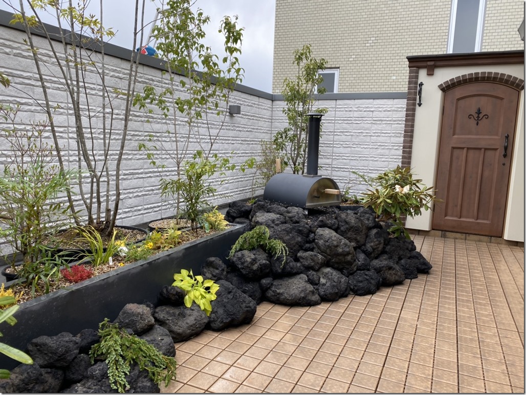 テラスには植栽のほかにディーズガーデンのおしゃれな物置「カンナキュート」・ファイヤーサイドのピザ窯「カブト」を設置してあります。お客様に聞いたところピザ窯でピザを作って食べたそうで、美味しくできと伺いうれしくなりました。