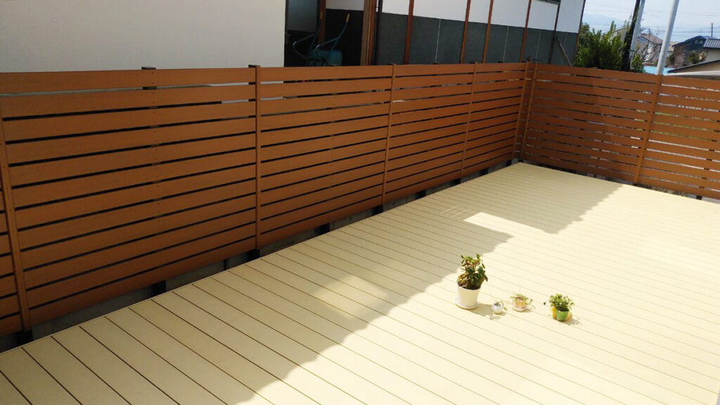 また、お隣の室外機やエコキュートなどの生活感のある設備は、人工木フェンス「マイティウッドフェンス」で上手に目隠し。