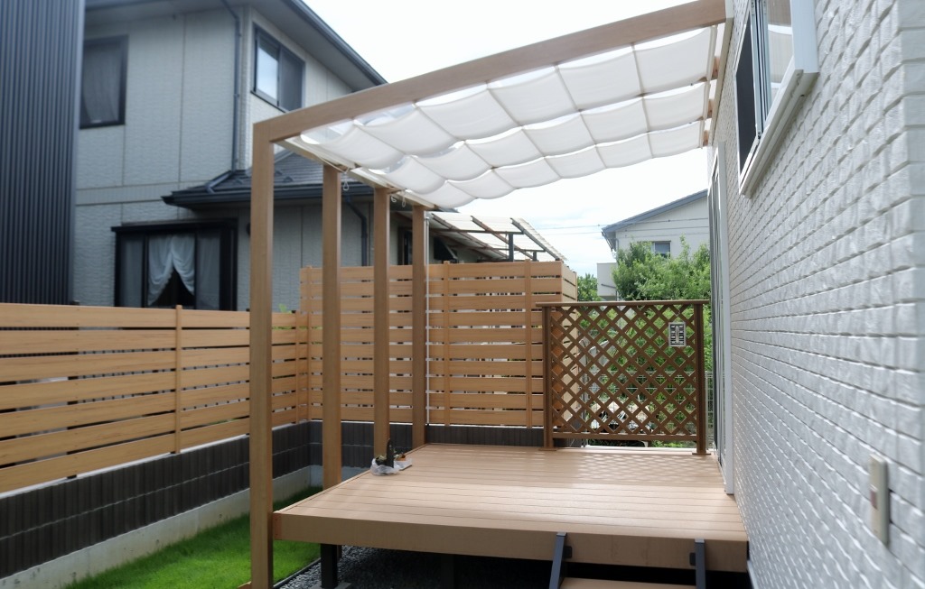 既存のタイルデッキにはリクシルの「フーゴ」を設置し、雨や日差しを遮ることで、アウトドアリビング空間をより快適にしました。