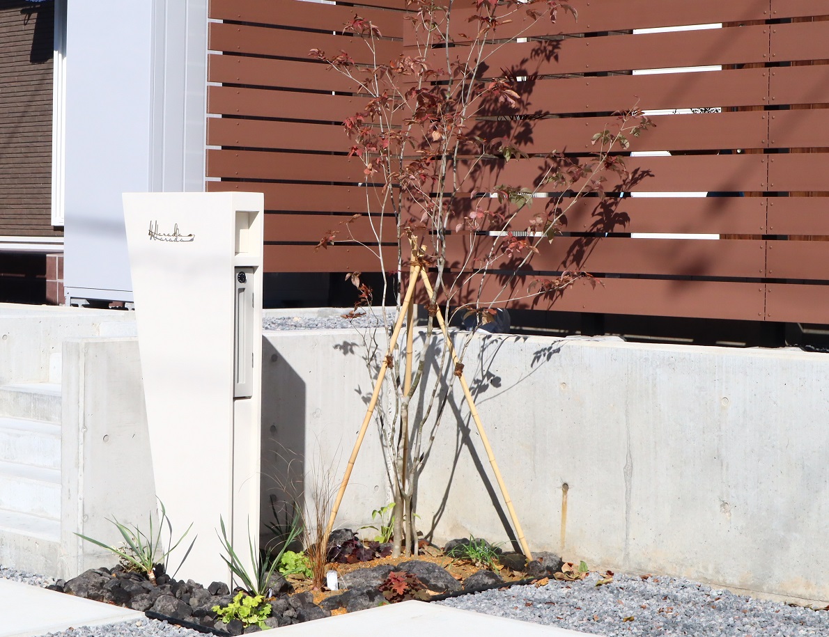 門柱横の植栽スペースにも枕木材を使用して温かみとデザイン性をアップしています。暖かくなり植えさせていただいたアオダモから葉が出てくると一層見栄え良くなります。