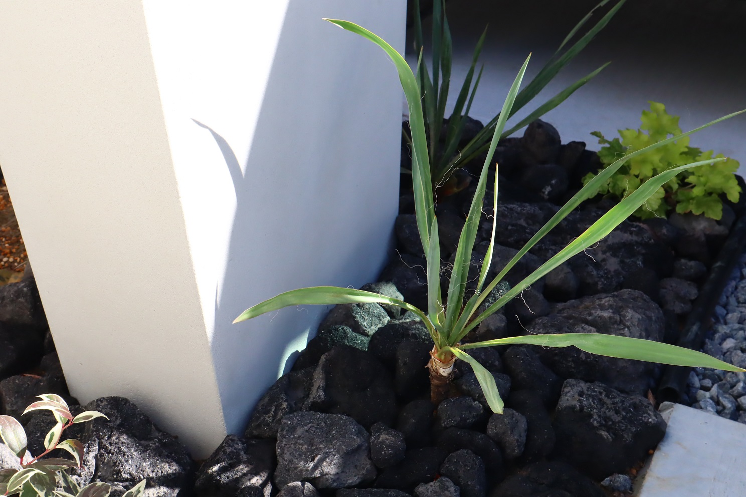 アプローチのインターロッキングは高級感を出すために大判サイズの商品を使用していますが、単調にならないようにサイズ違いの商品も入れて変化を付けました。