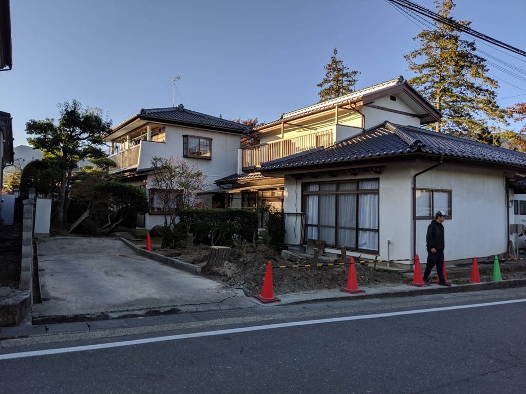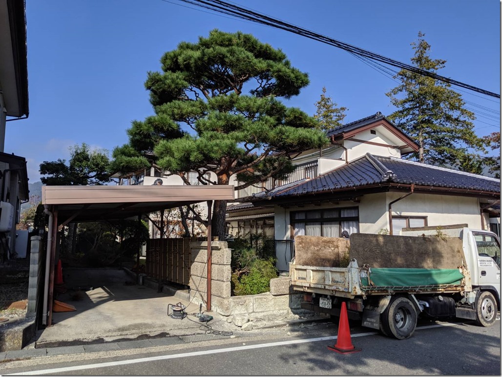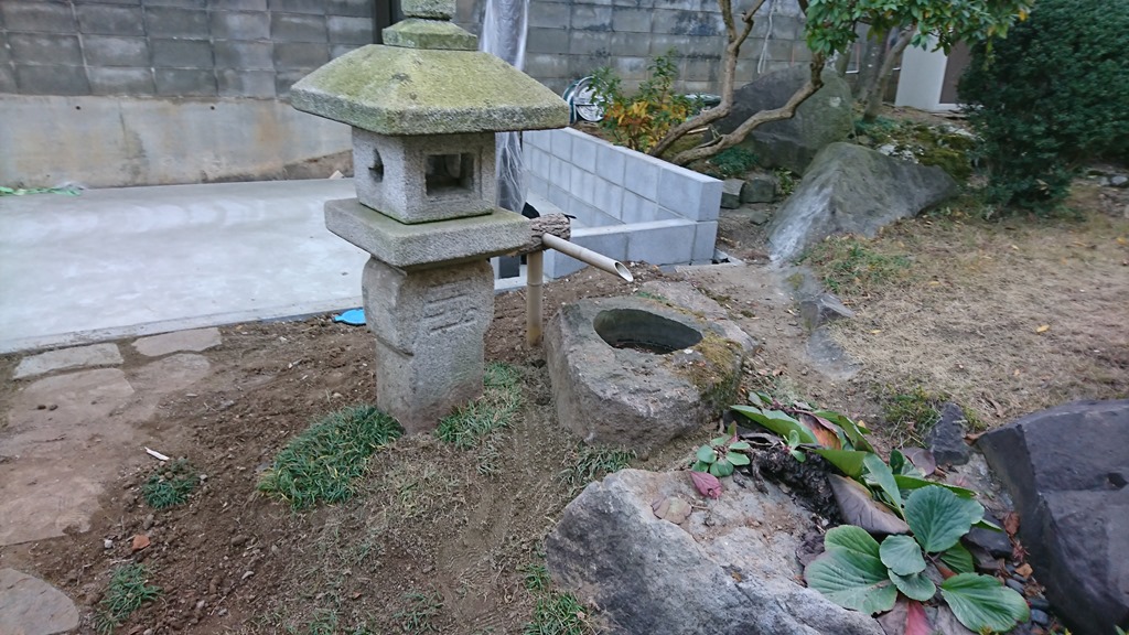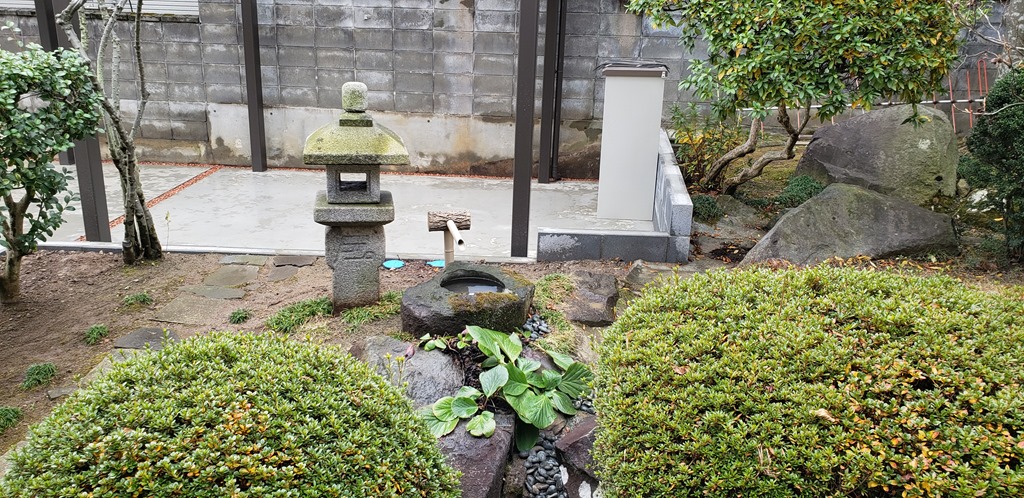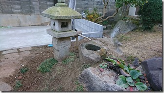 駐車スペースを広くとるために、お庭にある大きな松を伐採します。塩や清酒でお清めをして丁寧に伐採させていただきます。お庭の既存の石水鉢を移動して、工事がおわったら戻します。