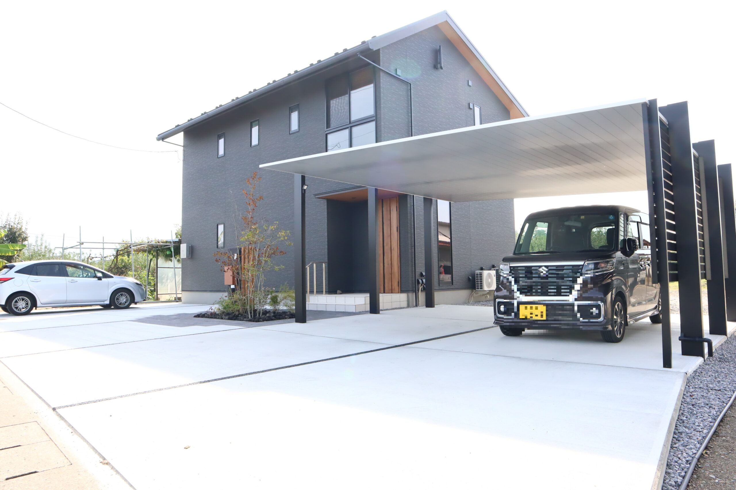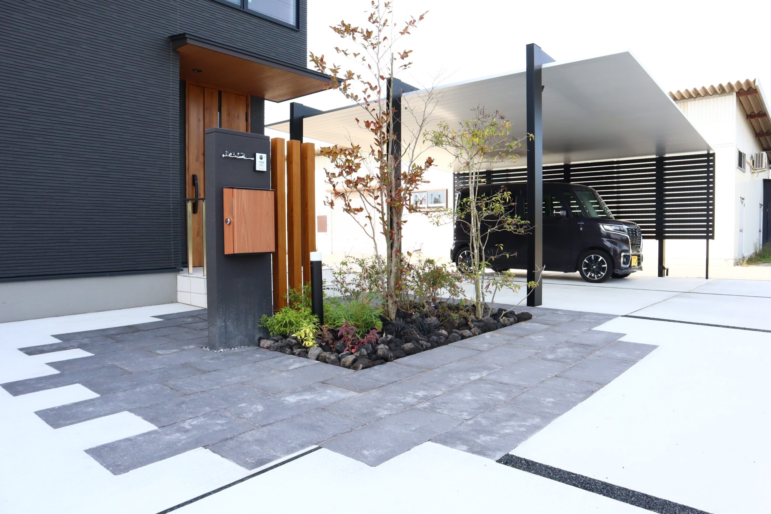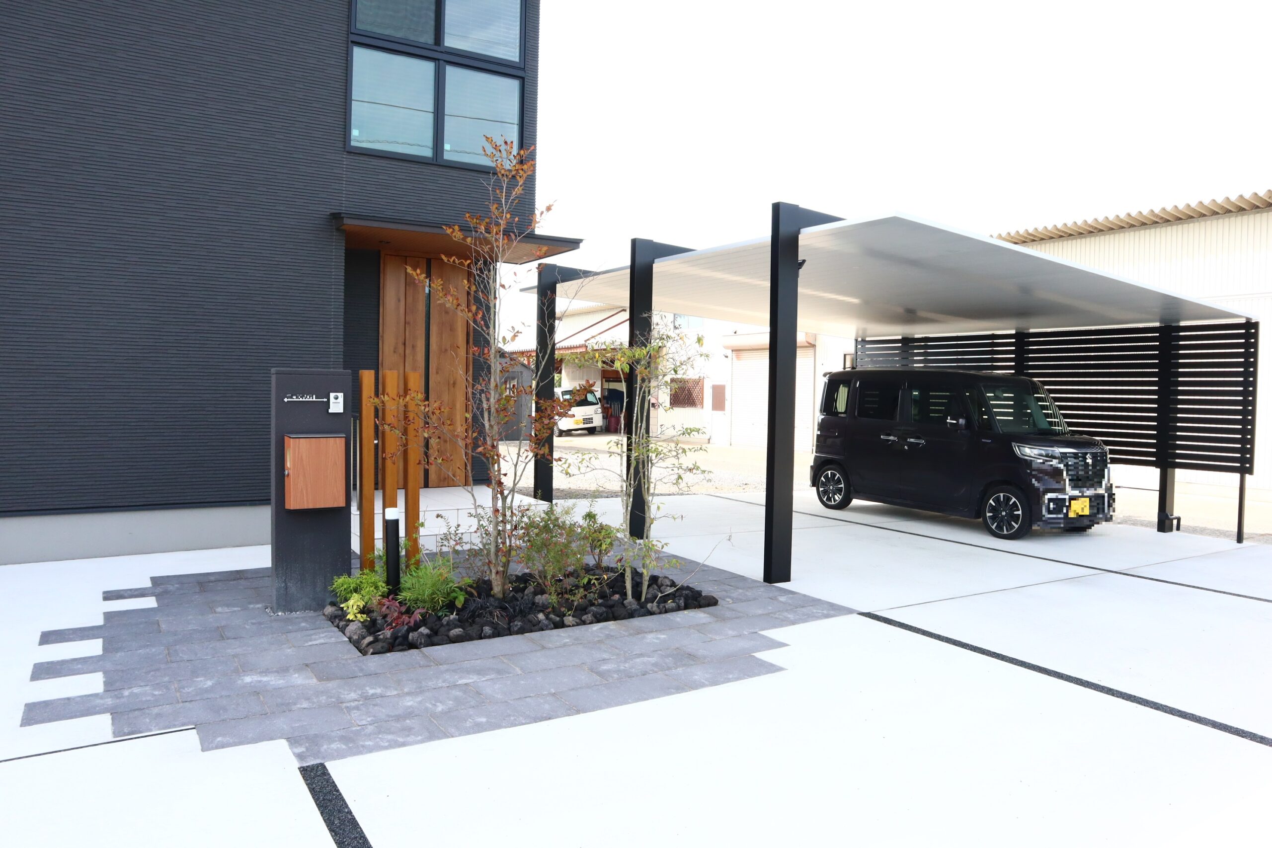 今回は、駐車スペースと庭をメインに施工させていただきました。元々は砕石敷きのスペースにコンクリートを打設。駐車スペース前は砕石転圧にすることでお車も通れますし、いずれコンクリートを打設するとなった時に施工しやすくなります。カーポートはLIXILのソルディーポートをブラック色でお選びいただきました。カラーを建物の外壁、サッシの色と合わせたことでまとまりを出しています。