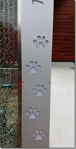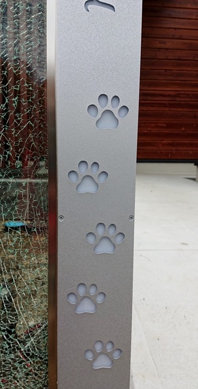 現在施工中の現場で、toledoのオリジナルの門柱を施工しています。 アルミH鋼の柱にジュエルグラスを取付け、アルミH鋼にサインプレートを造り散りつけた門柱です。アルミH鋼は10センチ角で塗装はサテンシルバ仕上げ。幅30センチのジュエルグラスを挟み込みます。サインプレートもオリジナルなので、お客様がワンチャンが大好きなので足型のデザインもレザーカットで抜き裏側にアクリル板の乳白色を貼りつけました。このプレートの中にオリジナルのLEDテープを取付けている為に暗くなりトランスが作動すると灯りが点灯してとても素敵に見えてきます。
