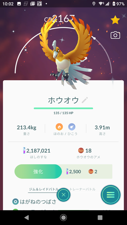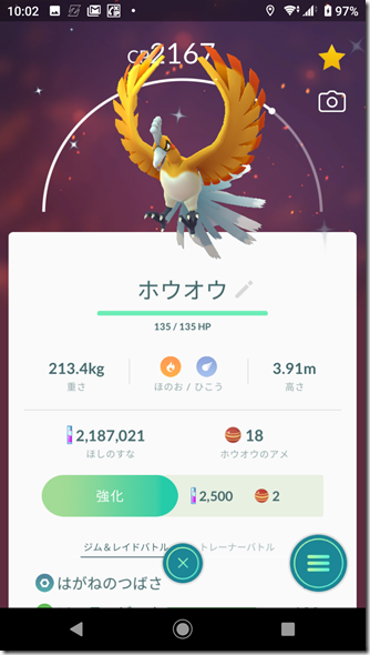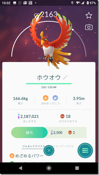 でたぁ 今、レイドの5ボスにホウオウが出ている。 5ボスとの対戦は、最低4人はいないと勝てそうもないので、今迄は、なかなか対戦する事が出来ずにいたければ、リモートレイドパスが登場してからは、シ゛ムから離れていても戦線できるようになり参加している。自分の家の近くだと人が全然集まらないので、集まりそうな場所に移動して、ボスの卵が割れてから、すぐに入らないと定員が20名なので、気を付けないと、それと20名といってもリモトレ参加は10名なのではじき出されてしまう事もある。 オレンジ色のホウオウは通常の姿で、色違いが金色、参加人数が多いとポケモン一匹で倒せるときもある。 ボス対戦は勝利してからも大変ゲットしなければならないので、参加するときに大親友と一緒に参加するとボールが+4になりボール17という時もある。 それでも、すべてのボールを当てても逃げられてしまったり。 昨日は色違いのホウオウをゲットする事が出来た。 きんのズリのみではなく色違いであればナナのみで大丈夫、1球でゲット。 4年前スタッフがポケモンをやっていても全く興味がなく それでも始めるとなかなか面白い、携帯の使用料以外課金をしなければ、お金を使わず楽しめるのだから嬉しい。 明後日から新しい5ボスに変わるのでホウオウのゲットが難しくなる このホウオウの色違いはサービスなのか10%はあるようだ。 10回に一度。