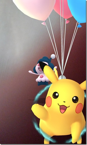 ふうせんの付いた輪に乗っての登場。 のせいにいるピカチュウ、相棒などをカメラで撮影すると、一緒に写っていてゲットする事もできる。 昨年の秋から始めたので、まだゲットしていないポケモンも多い、ピカチュウは、衣装を変えたり帽子をカブッタリたりして、手にいれていないピカチュウもいる。 どのピカチュウも可愛いけれど、そら飛ぶピカチュウは想定外の可愛さ。 ここ数日で何匹もゲットしたので、増えてしまい、今は☆3以外は消去 中には交換要員で昨日、どうせ捨てるならと、フレンドと☆ふたつの、そら飛ぶピカチュウを交換したらキラになり☆3に変わった きらは嬉しい。