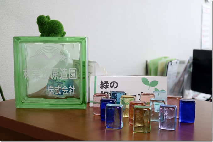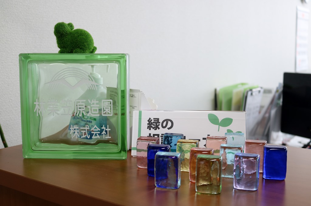 林業笠原造園(株)の受付カウンターの上に、クリスタルグリーンで造られたガラスブロックサインが置かれていました。